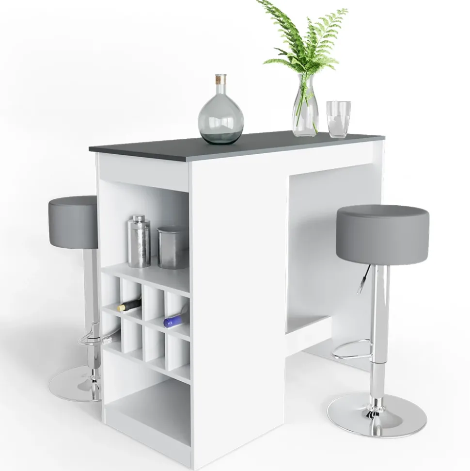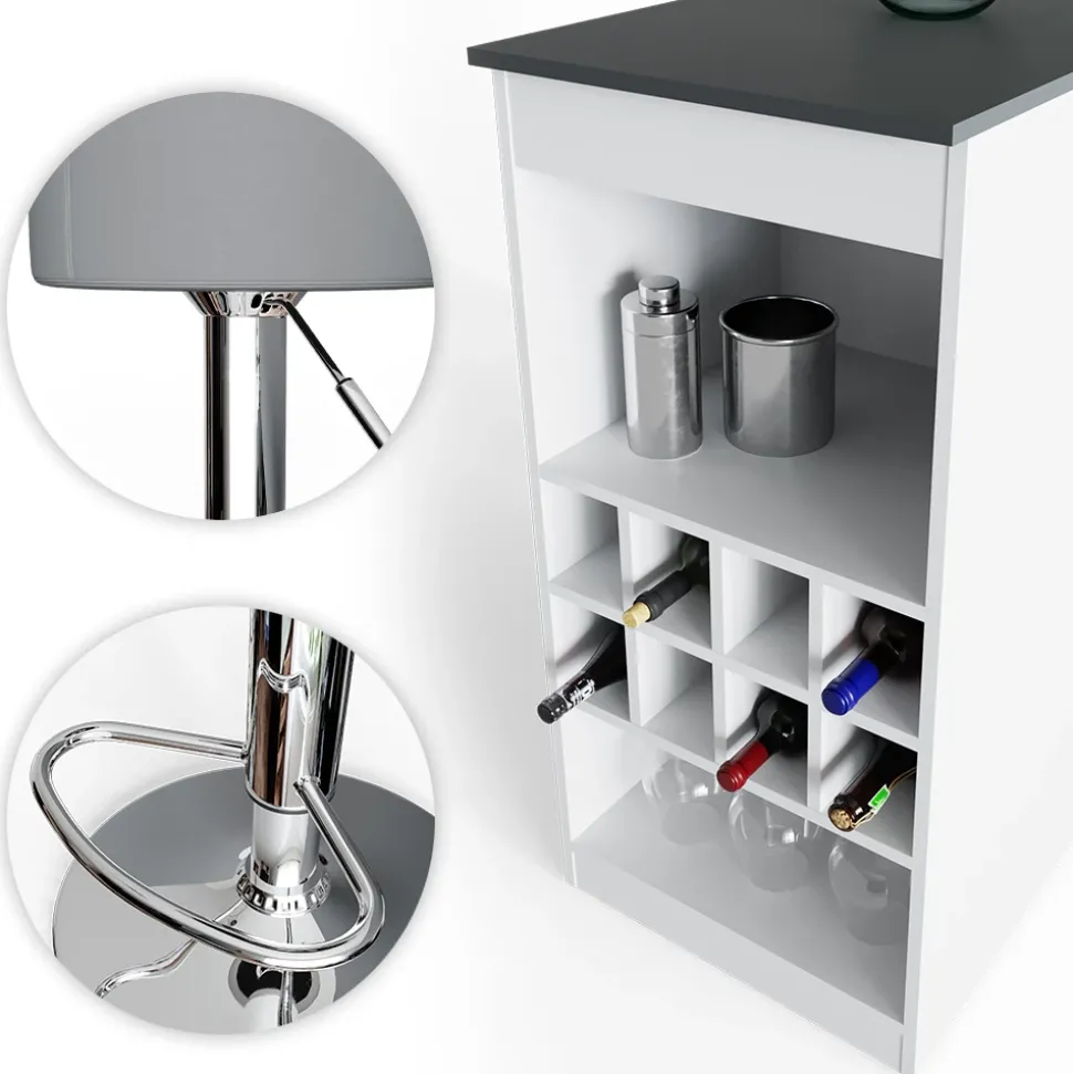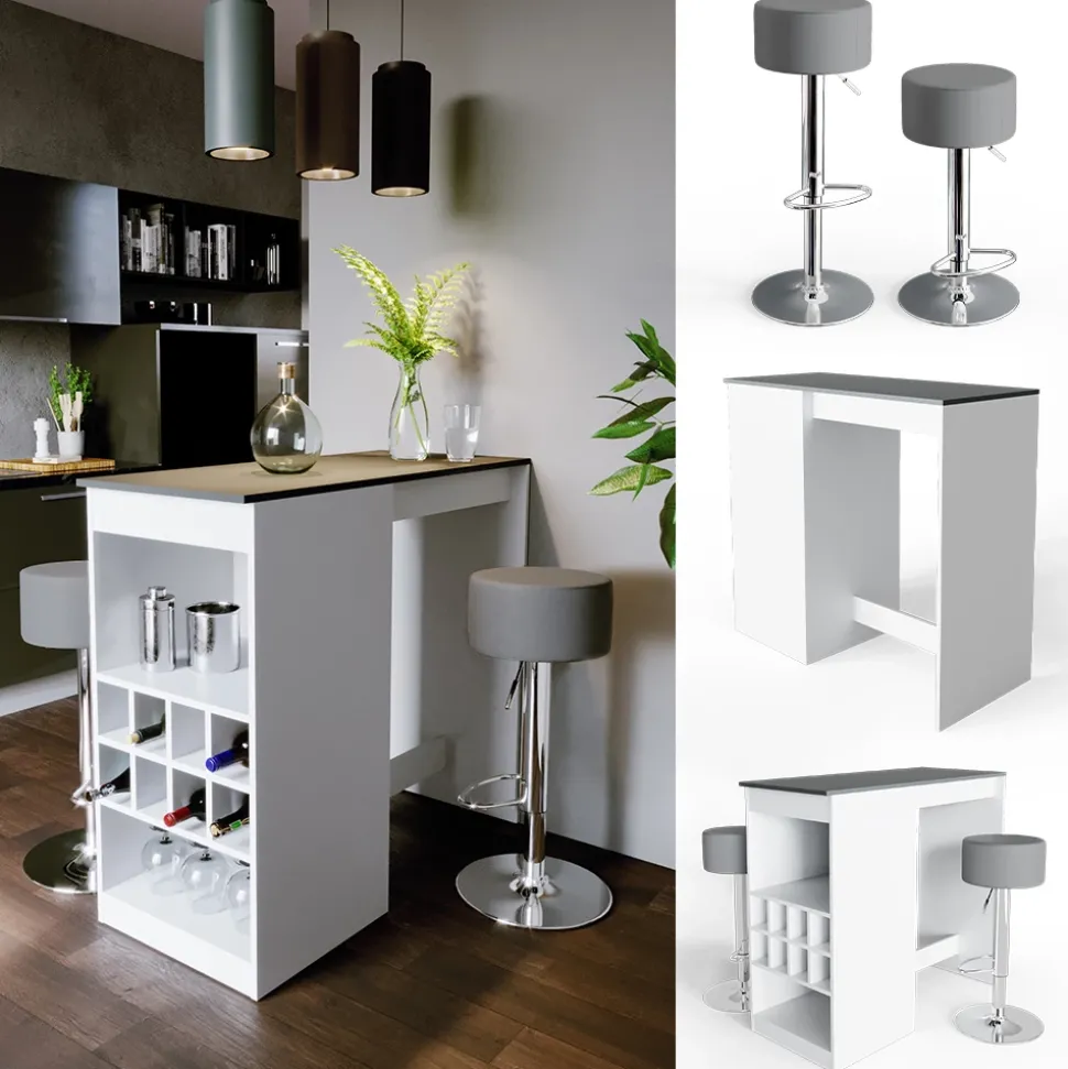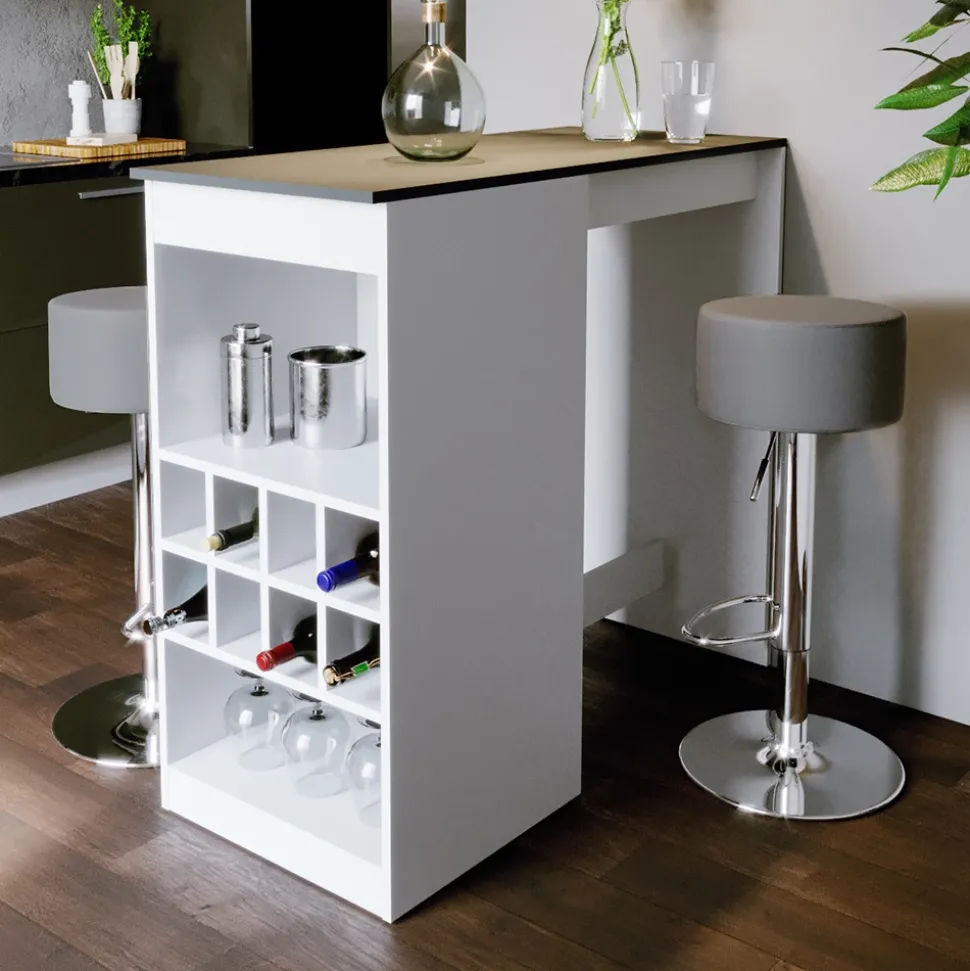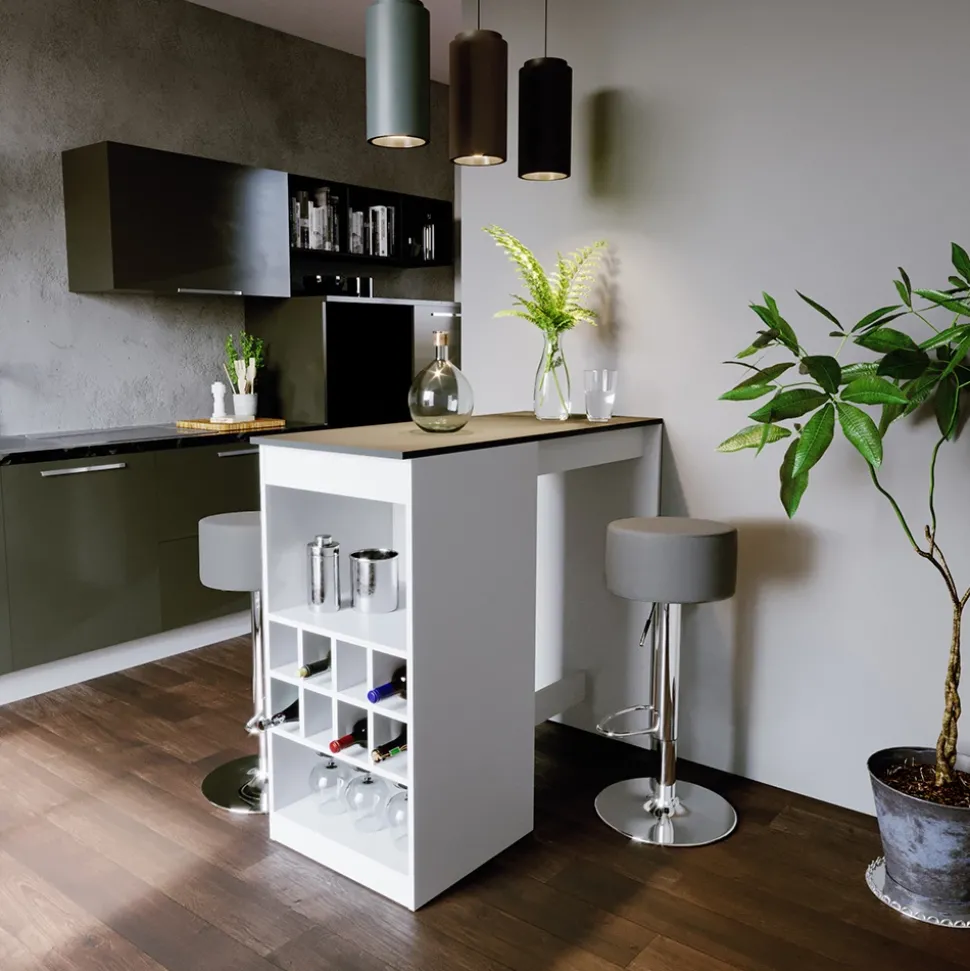 - Der Bartresen und Hocker sind eine funktionelle und geräumige Lösung für die Küche, mit offenen Flaschenfächern für einen schnellen Zugriff auf Getränke.