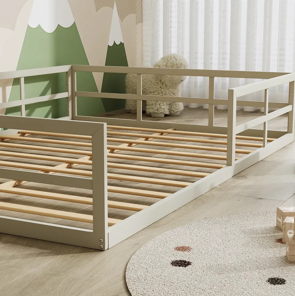 Das Kinderzimmerbett aus Metall ist als Bodenbett konzipiert und unterstützt nach Montessori-Prinzipien das selbstständige Ein- und Aussteigen Ihres Kindes. Der stabile Metallrahmen gewährleistet eine sichere Nutzung, während der integrierte Rausfallschutz für ungestörten Schlaf sorgt. Das Bett ist in verschiedenen Größen erhältlich, sodass Sie die passende Variante für Ihr Kinderzimmer wählen können. Es schafft einen komfortablen Schlafplatz und sorgt Tag für Tag für Geborgenheit.