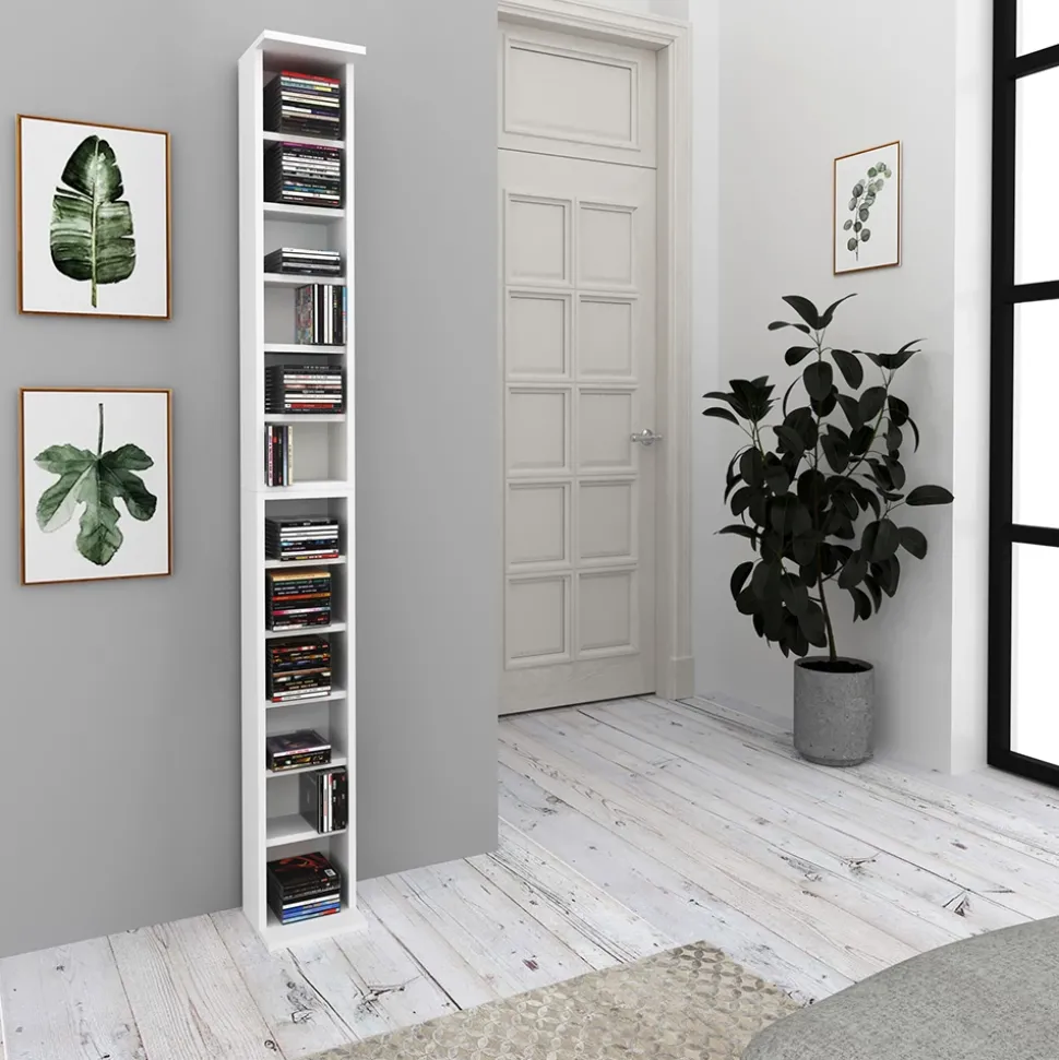 Mit dem CD-Regal halten Sie Ihre DVD-Sammlung, Blu rays und CDs ordentlich und griffbereit. Das funktionelle Design mit 12 offenen Regalen bietet ausreichend Platz für Ihre Lieblingsfilme und Musik. Die vollständig höhenverstellbaren Fachböden sorgen für individuelle Anpassungsmöglichkeiten. Das Regal kann sowohl freistehend als auch an der Wand montiert werden und lässt sich perfekt mit anderen Möbelstücken kombinieren. Nutzen Sie dieses praktische Möbelstück, um Ihre Mediensammlung stilvoll zu präsentieren und einen Hauch von Persönlichkeit in Ihre Einrichtung zu bringen.