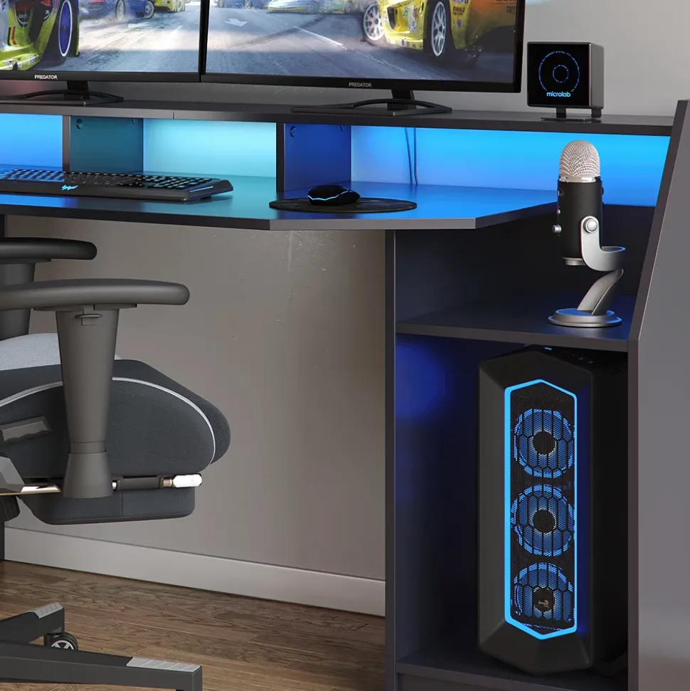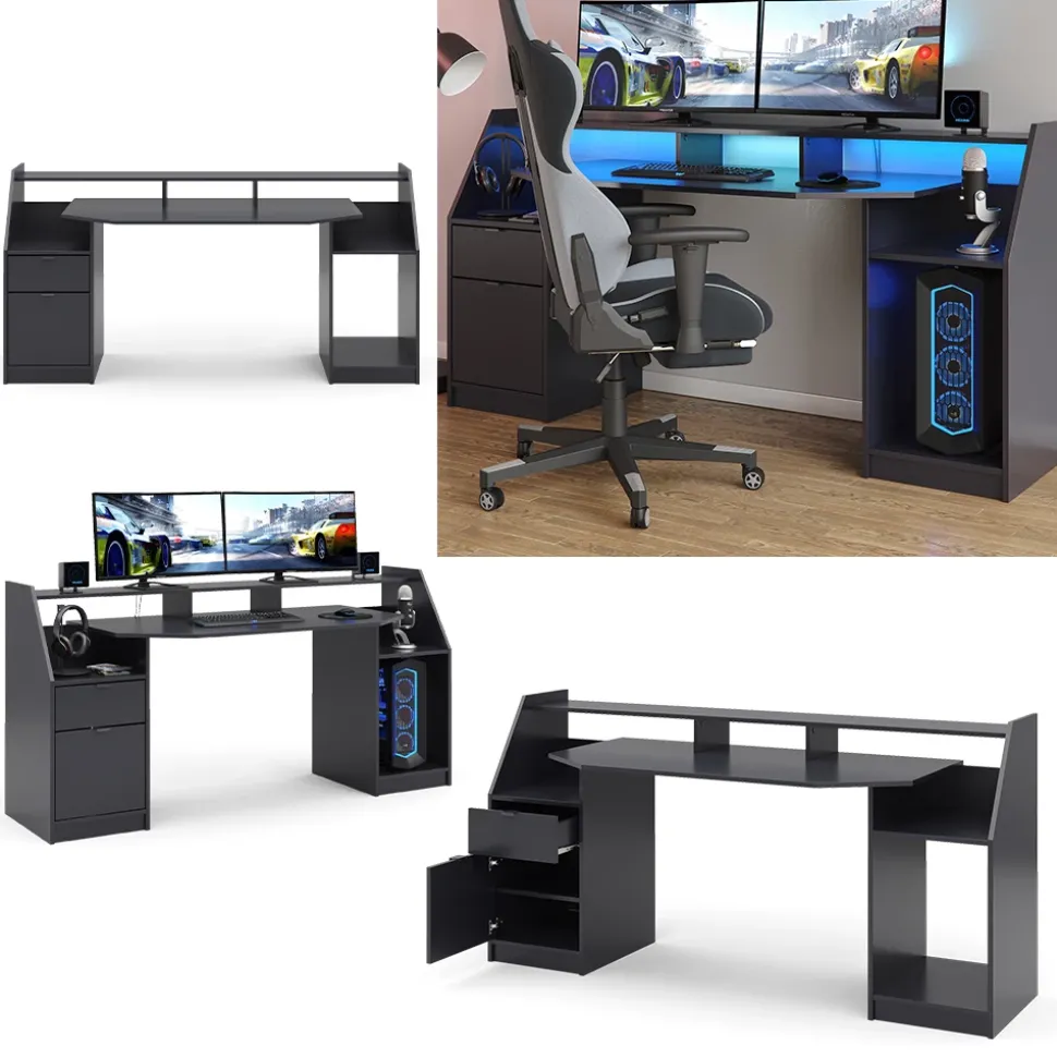 - MAßE: Der Gaming Schreibtisch hat eine Breite von 179,8 cm, eine Höhe von 90,6 cm und eine Tiefe von 65,5 cm. Alle detaillierten Größen sind auf den Fotos angegeben.