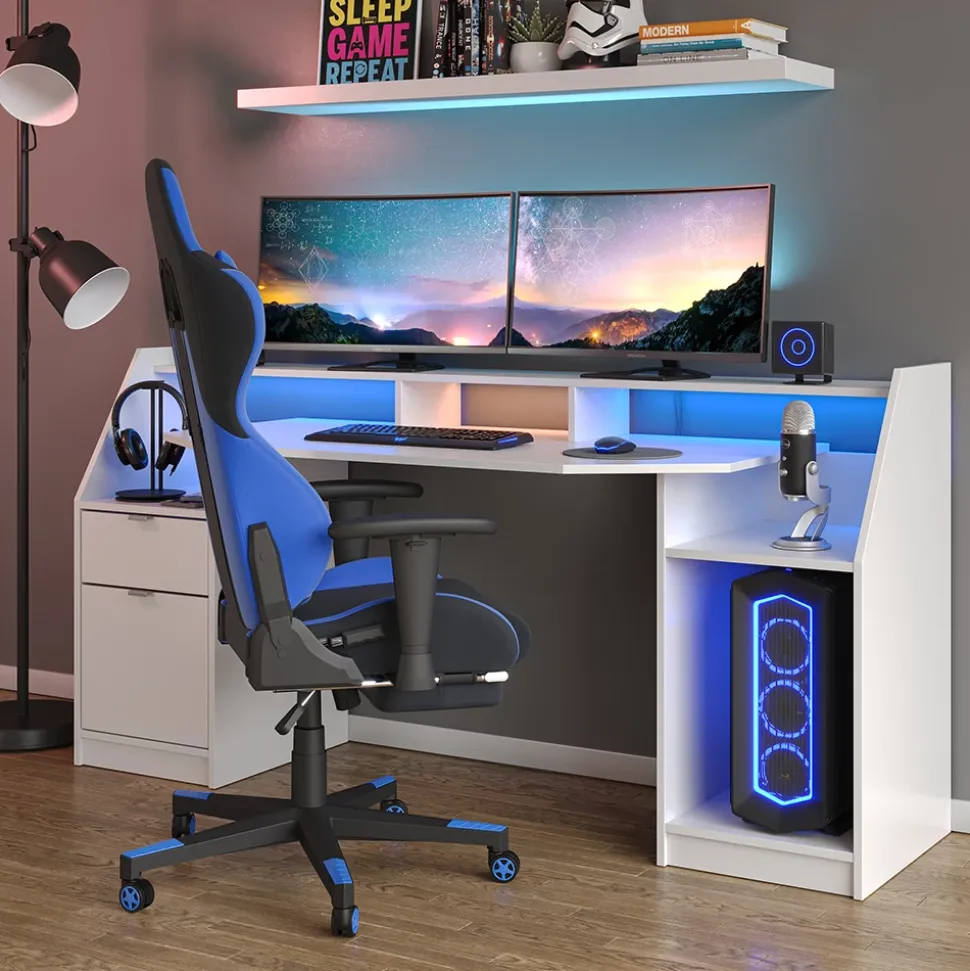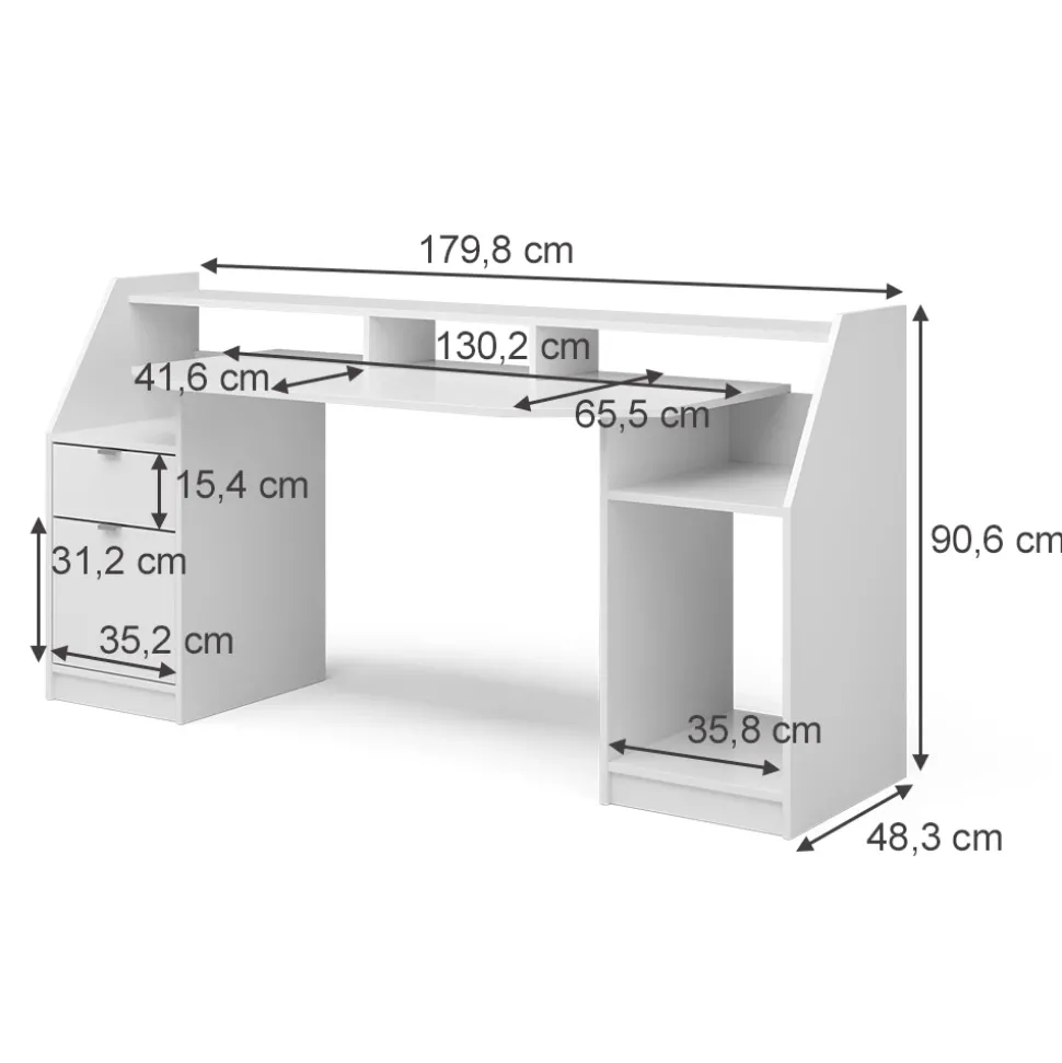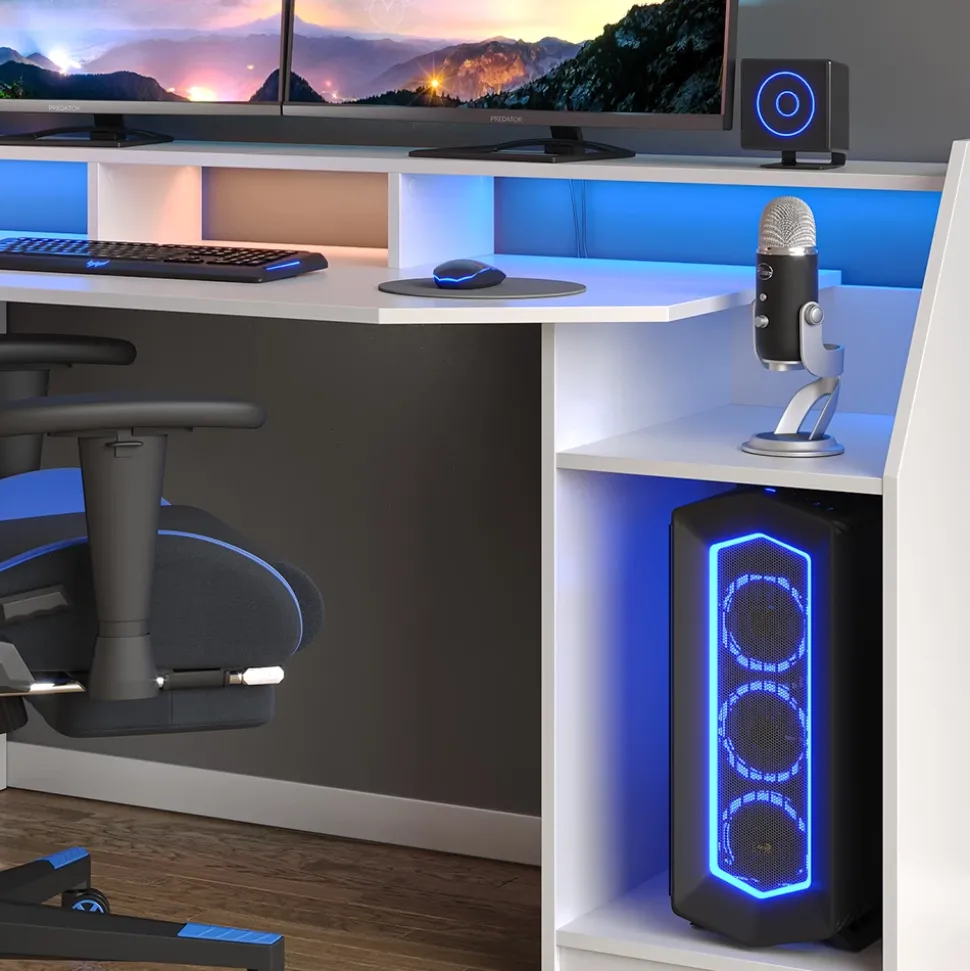 - MAßE: Der Gaming Schreibtisch hat eine Tiefe von 66 cm, eine Breite von 180 cm und eine Höhe von 91 cm.