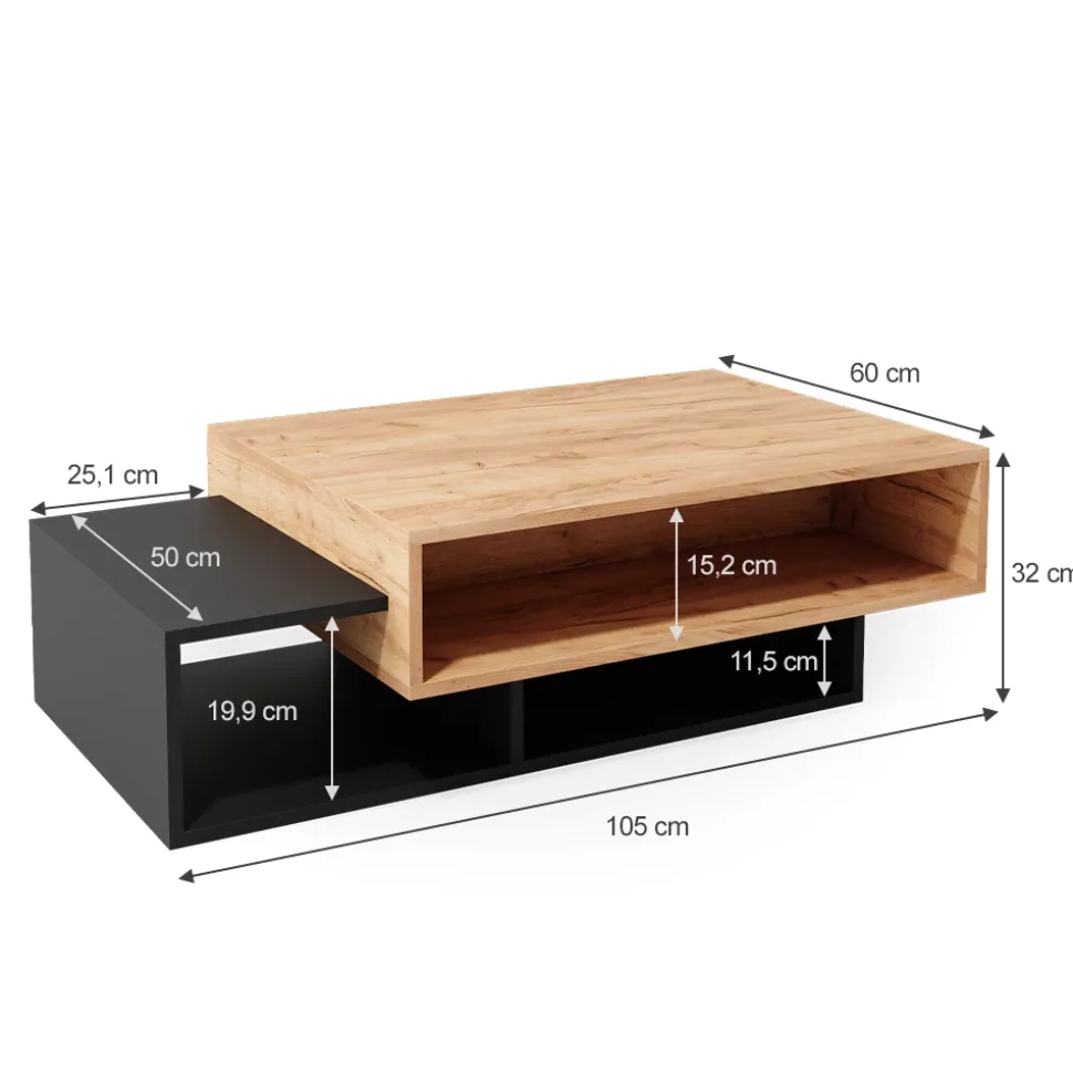 - MAßE: Der Wohnzimmertisch mit Stauraum hat eine Breite von 105 cm, eine Höhe von 32 cm und eine Tiefe von 60 cm. Alle detaillierten Größen sind auf den Fotos angegeben.