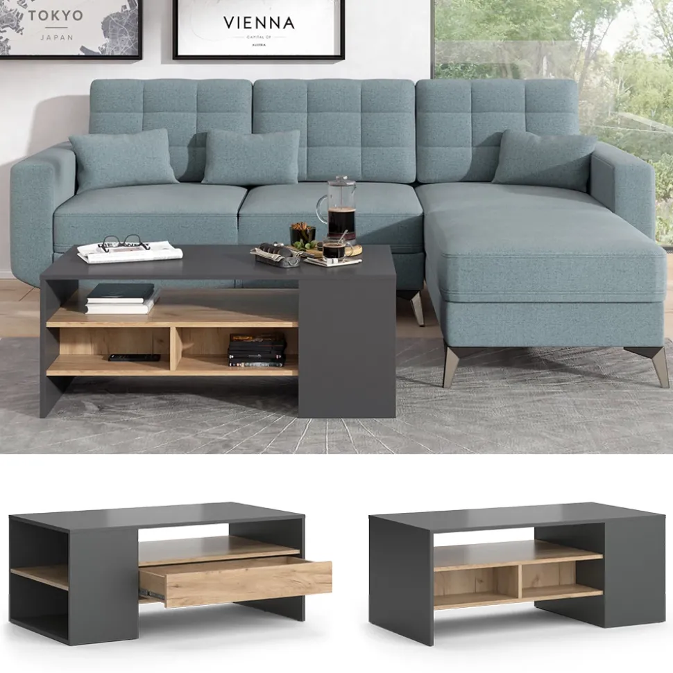 - Der Wohnzimmertisch mit Schublade bietet reichlich Stauraum dank seiner offenen Regale und der ausziehbaren Schublade. Er ist ein praktisches Möbelstück für das Wohnzimmer.