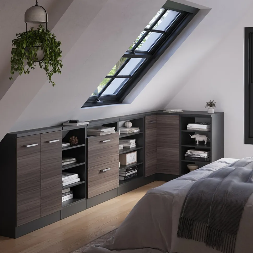 - Die Dachschrägenmöbel Rion sind die ideale Lösung, um ungenutzten Raum unter dem Dach optimal zu nutzen. Sie ermöglichen eine durchdachte und effiziente Gestaltung des vorhandenen Platzes.