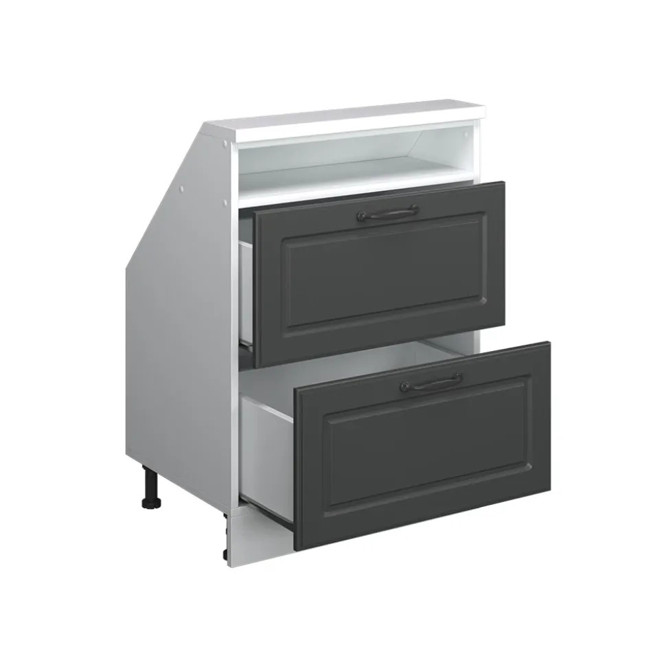 Der Dachschrägenschrank Rion ist die ideale Lösung, um Ihre Dachschrägen optimal zu nutzen. Mit zwei ausziehbaren Schubladen und einem offenen oberen Fach bietet er großzügigen Stauraum für Kleidung und Alltagsgegenstände. Die robuste Konstruktion und die schräge Oberseite machen ihn zu einem stabilen und stilvollen Möbelstück. Versteckte Füße sorgen für sicheren Stand und ein elegantes Gesamtbild.