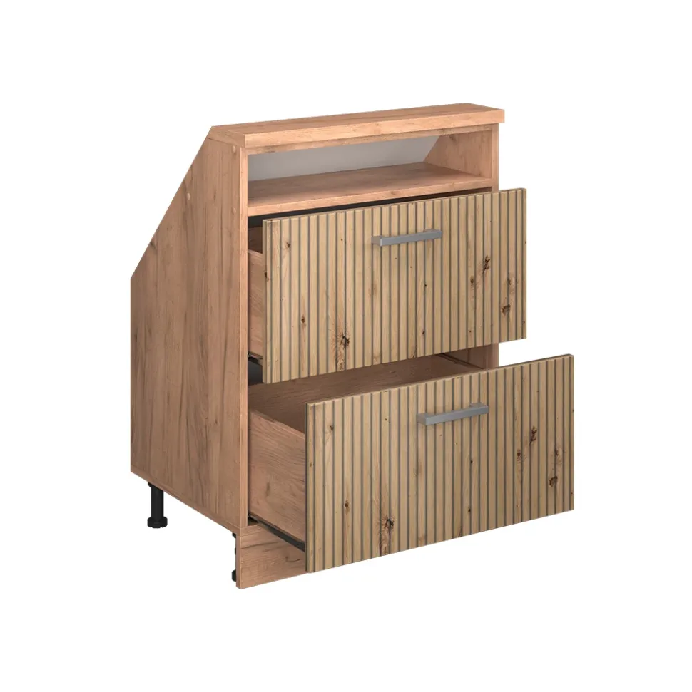 Der Dachschrägenschrank Rion ist die perfekte Lösung für alle, die ihre Dachschrägen optimal nutzen möchten. Mit zwei ausziehbaren Schubladen und einem offenen oberen Fach bietet er großzügigen Stauraum für Kleidung und andere Alltagsgegenstände. Die robuste Konstruktion und die schräge Oberseite machen ihn zu einem stabilen und stilvollen Möbelstück. Die versteckten Füße sorgen für einen sicheren Stand und ein elegantes Gesamtbild.