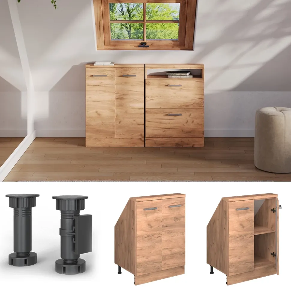 Der Dachschrägenschrank Rion ist die ideale Lösung, um ungenutzten Platz unter Ihrer Dachschräge optimal auszuschöpfen. Mit seinen zwei Türen bietet er großzügigen Stauraum für Kleidung, Bücher oder andere Gegenstände. Die robuste Konstruktion und die abgeschrägte Oberseite machen den Schrank besonders stabil und perfekt geeignet für schräge Wände. Bequeme Griffe und versteckte Füße sorgen für ein harmonisches Gesamtbild und machen den Dachschrägenschrank Rion zu einem praktischen und stilvollen Möbelstück für Ihr Zuhause. Bringen Sie Ordnung in Ihre Dachschräge – mit dem Dachschrägenschrank Rion!