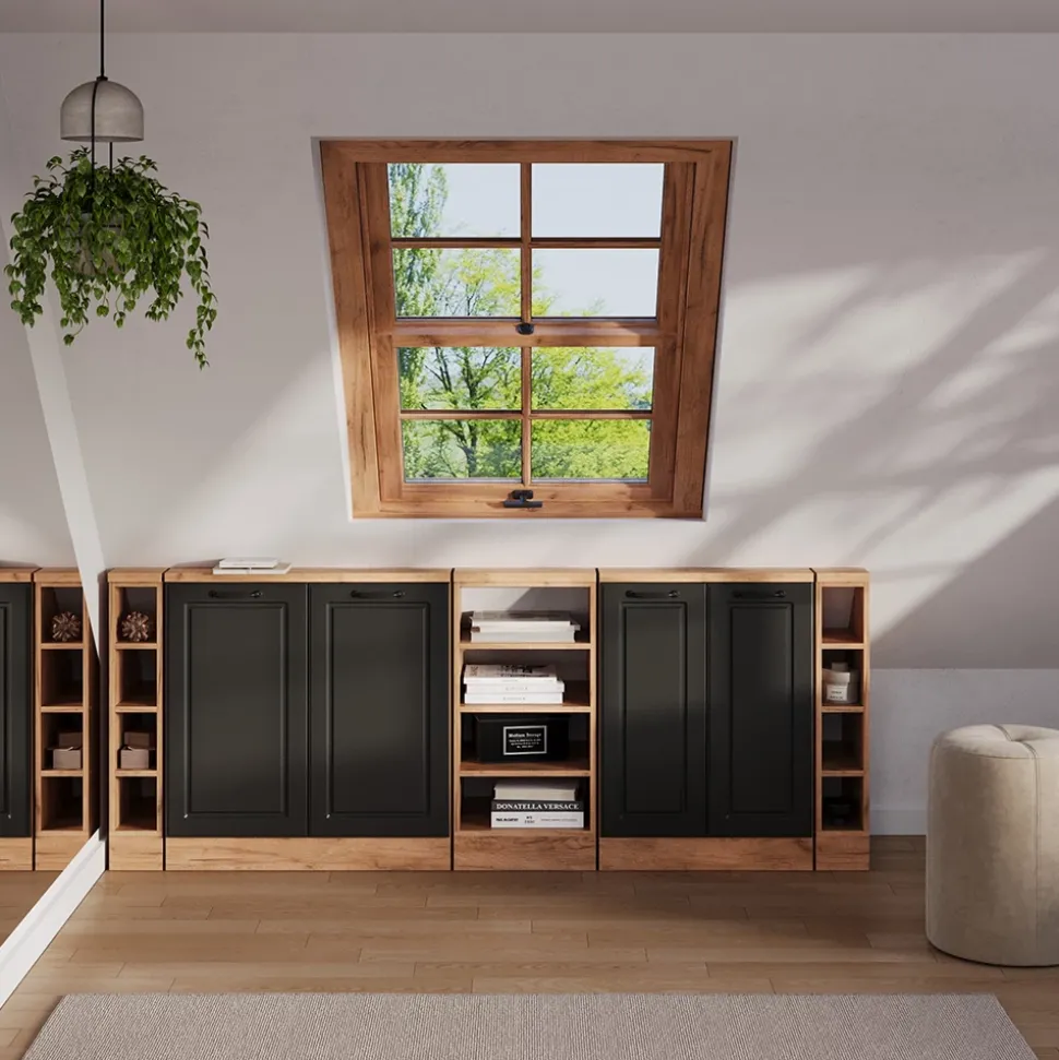 - Das Dachschrägenmöbel-Set besticht durch offene Seitenregale und eine robuste Konstruktion, perfekt für schräge Oberseiten in Dachgeschossen.