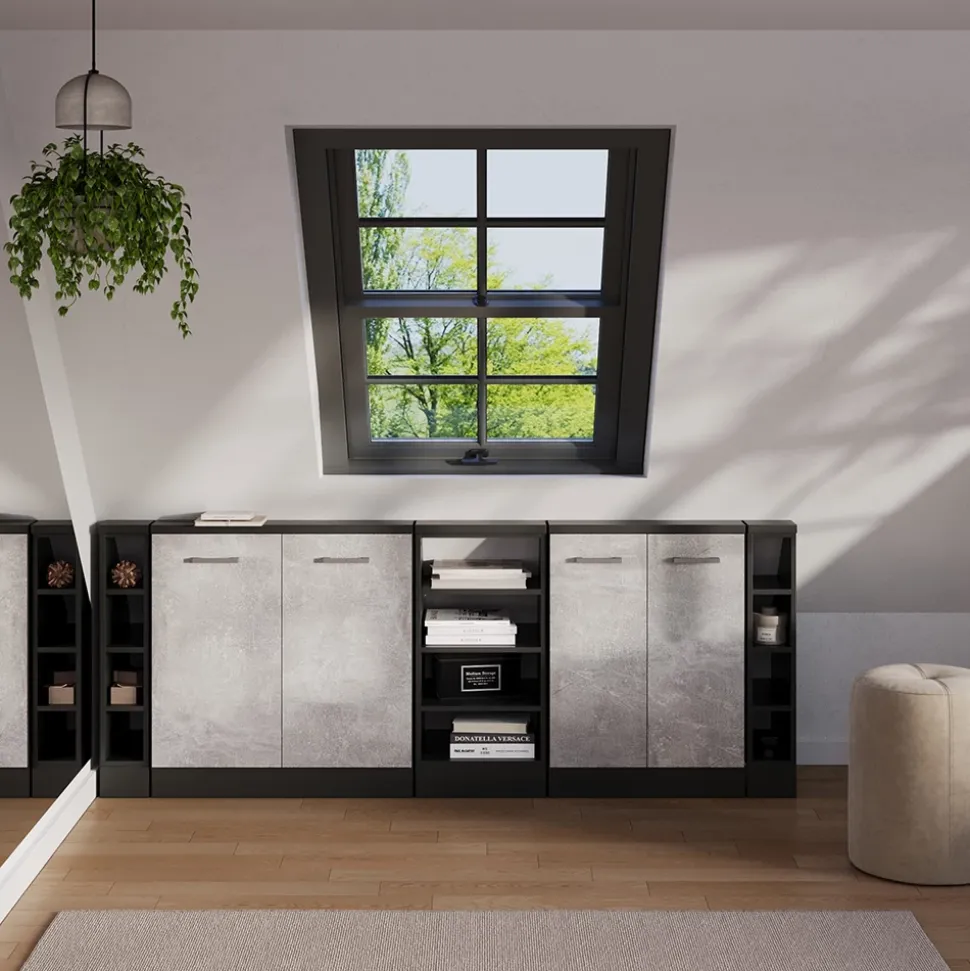 - Das Dachschrägenmöbel-Set besticht durch offene Seitenregale und eine robuste Konstruktion, perfekt für schräge Oberseiten in Dachgeschossen.