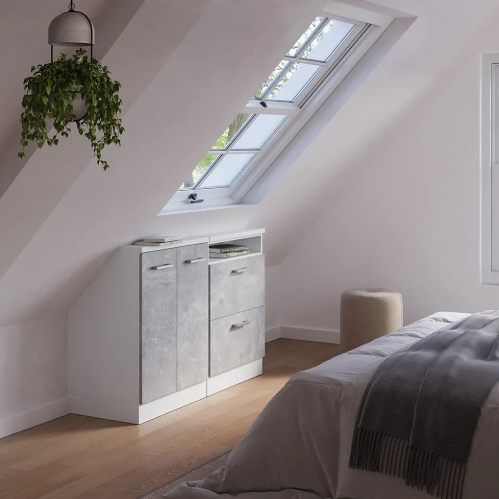 - Das Dachschrägenmöbel-Set besticht durch ein integriertes offenes Fach für zusätzlichen Stauraum und versteckte Füße für eine elegante Optik.