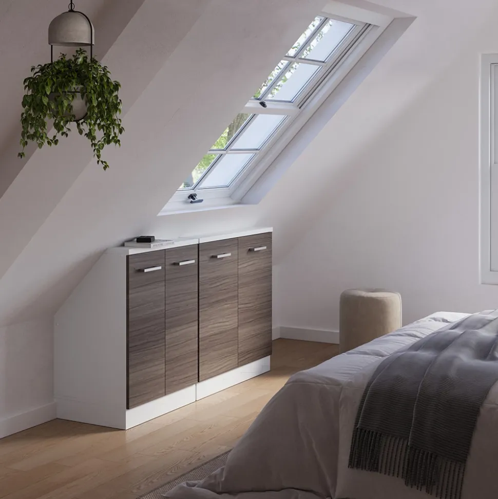 Der Dachschrägenschrank Rion ist eine durchdachte Lösung für Räume mit schrägen Wänden. Das speziell angepasste Schranksystem nutzt vorhandene Flächen effizient und schafft praktischen Stauraum. Mit seiner robusten Bauweise und den dezenten Griffen überzeugt Rion im Alltag durch Stabilität und Komfort. Die abgeschrägte Oberseite passt sich optisch harmonisch an. Eine clevere Wahl für mehr Ordnung und Platz unter dem Dach.