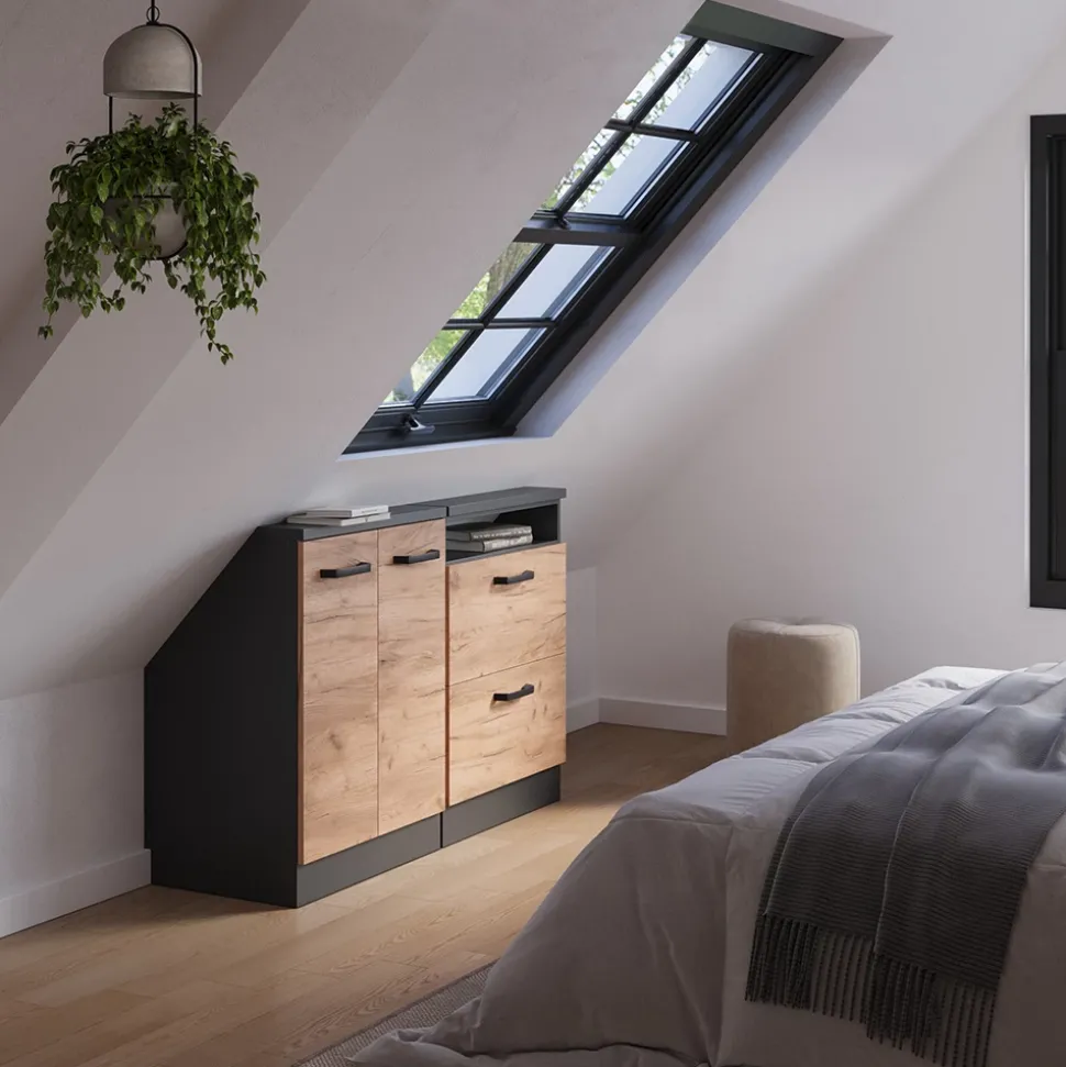Der Dachschrägenschrank Rion ist die perfekte Lösung für stilvollen Stauraum unter schrägen Decken. Mit Schubladen, Türen und einem offenen Fach bietet er viel Platz und sorgt für Ordnung – ob im Schlaf-, Wohn- oder Kinderzimmer. Ein echter Blickfang, der Funktionalität und Design vereint.