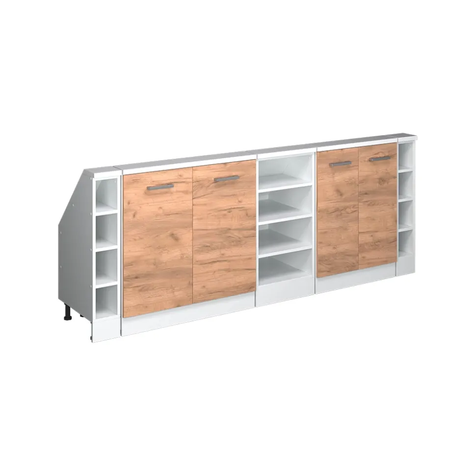 Der Dachschrägenschrank Rion ist die ideale Lösung für jedes Zuhause mit schrägen Wänden. Durchdacht gestaltet, bietet er geräumige, geschlossene Schränke, um all Ihre Habseligkeiten ordentlich zu verstauen. Die offenen Seitenregale eignen sich perfekt, um dekorative Gegenstände stilvoll zu präsentieren. Dank robuster Konstruktion und abgeschrägter Oberseite fügt sich der Schrank passgenau unter Dachschrägen ein. Versteckte Füße sorgen für Stabilität und ein elegantes Erscheinungsbild. Bringen Sie Ordnung und Stil in Ihr Zuhause mit dem Dachschrägenschrank Rion.