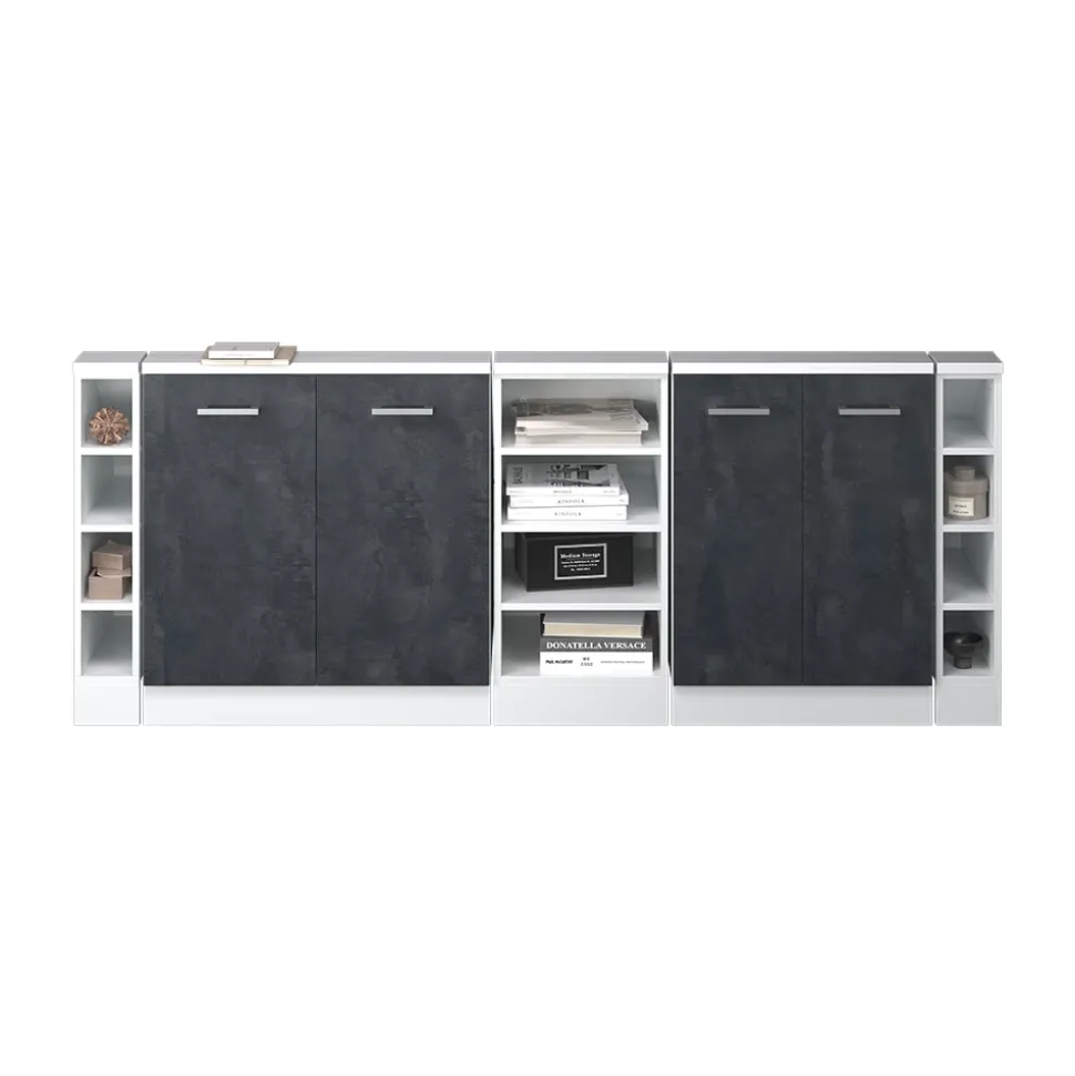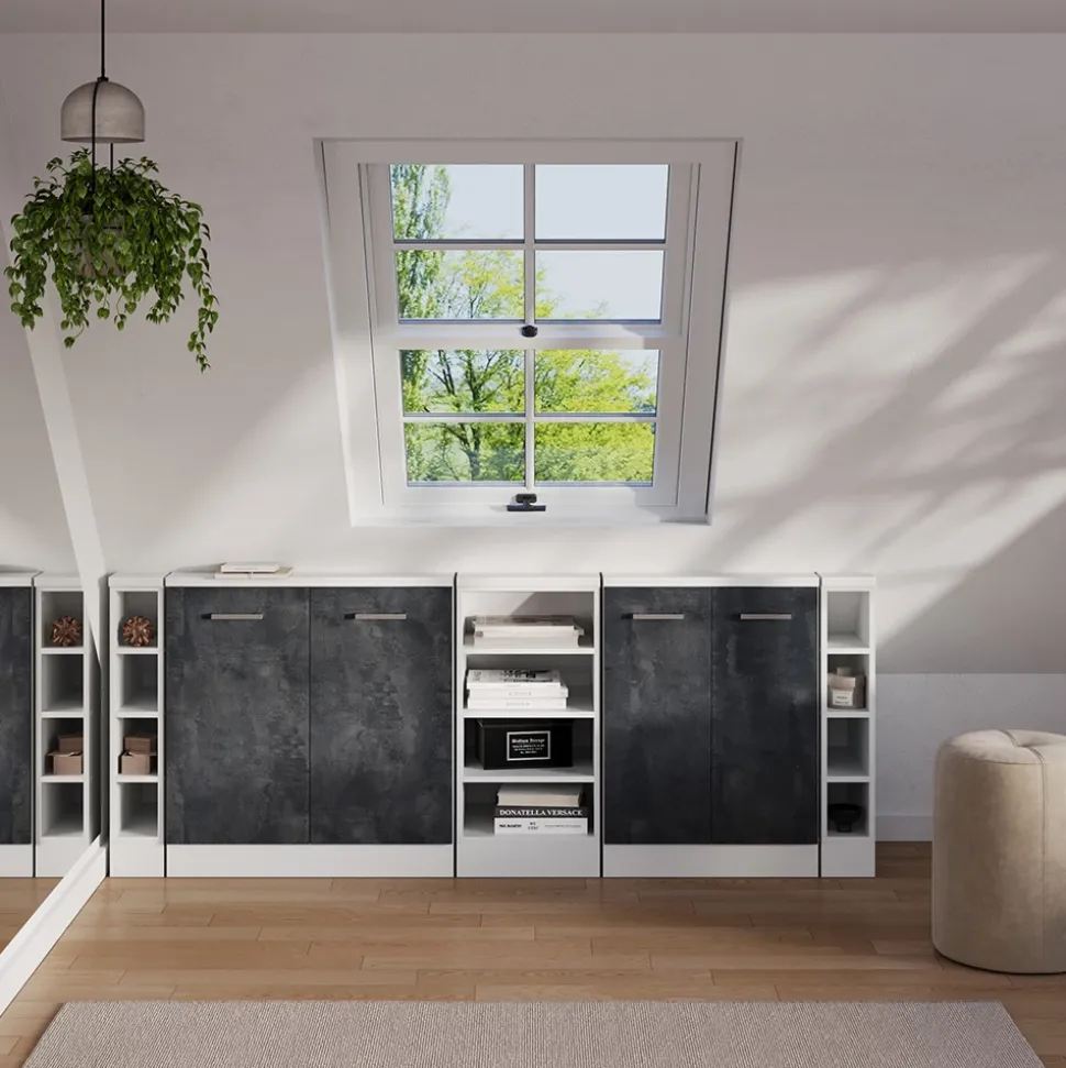- Das Dachschrägenmöbel-Set besticht durch offene Seitenregale und eine robuste Konstruktion, perfekt für schräge Oberseiten in Dachgeschossen.