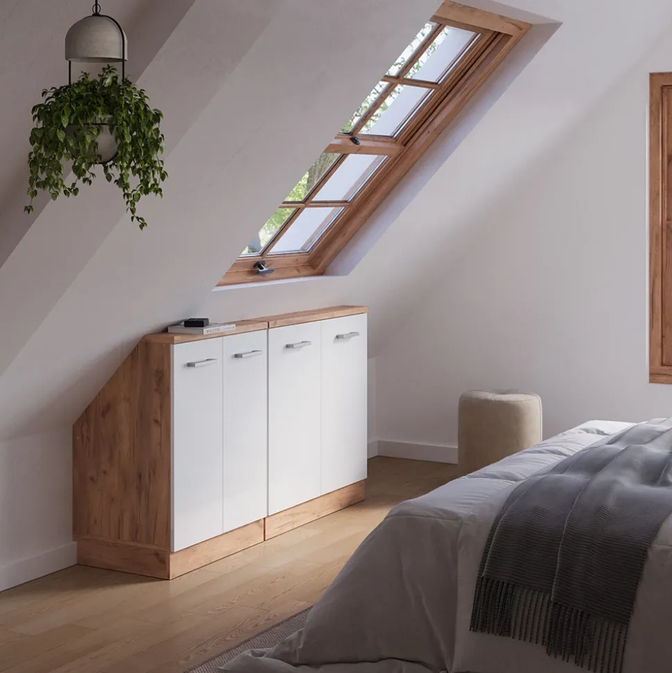 Der Dachschrägenschrank Rion ist eine clevere Lösung für Räume mit schrägen Wänden. Das speziell angepasste Schranksystem nutzt den vorhandenen Platz effizient und bietet praktischen Stauraum. Mit robuster Bauweise und dezenten Griffen überzeugt Rion im Alltag durch Stabilität und Komfort. Die abgeschrägte Oberseite fügt sich optisch harmonisch ein. Eine smarte Wahl für mehr Ordnung und Stauraum unter dem Dach.