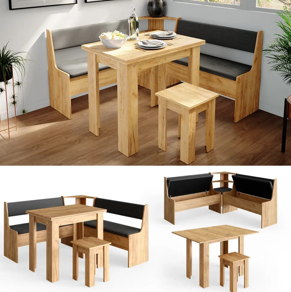 Die Eckbankgruppe Roman mit Tisch vereint klassischen Stil mit modernem Komfort und ist die perfekte Wahl für Ihre Küche oder Ihr Esszimmer. Die komfortabel gepolsterte Rückenlehne und der gepolsterte Sitz sorgen für Gemütlichkeit beim Essen oder gemütlichen Beisammensein. Die Eckbankgruppe ist eine fertige Lösung für Ihre Küche und der Esstisch mit Bank bietet ausreichend Platz für Familie und Freunde. Dieses Modell ist in verschiedenen Ausführungen erhältlich, um den Bedürfnissen und dem Geschmack jedes Einzelnen gerecht zu werden. Machen Sie Ihren Essbereich zu einem Ort des Wohlfühlens mit der charmanten Eckbankgruppe Roman mit Tisch.