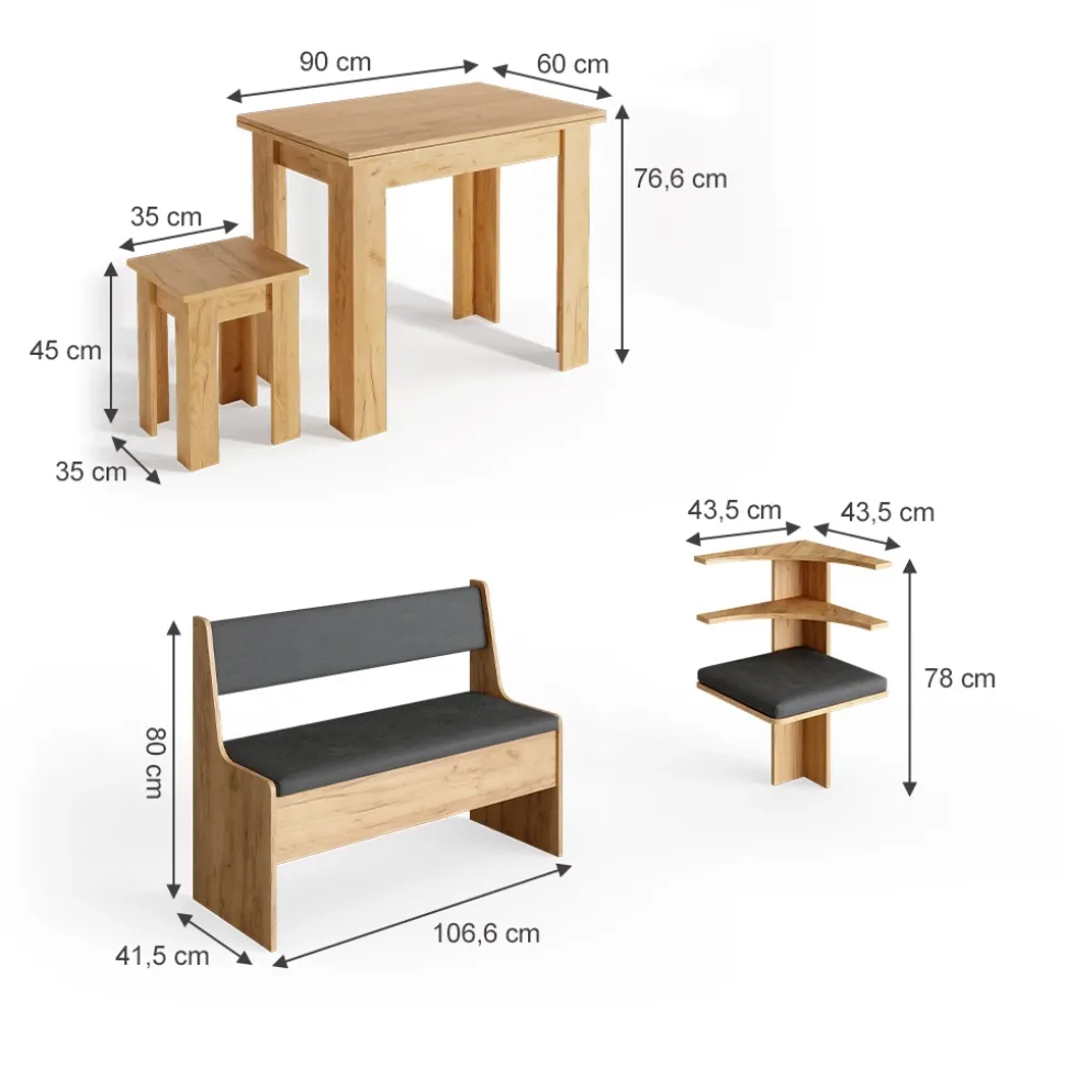 - MAßE: Die Bank hat folgende Abmessungen: Breite: 150×150 cm, Höhe: 80 cm, Tiefe: 41,5 cm. Größe des Esstisches: 90×76,6×60 Alle detaillierten Größen sind auf den Fotos angegeben.