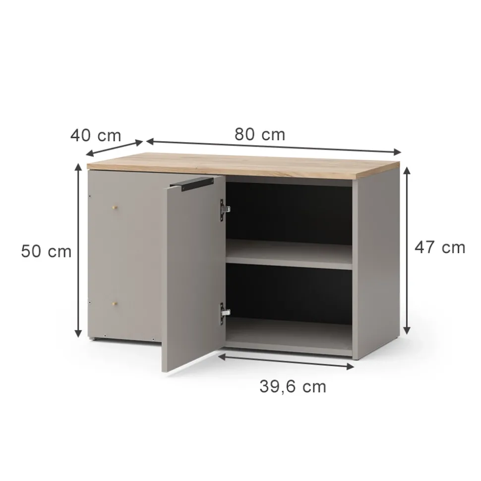 - MAßE: Die Kommode mit Tür hat eine Tiefe von 40 cm, eine Breite von 80 cm und eine Höhe von 50 cm. Alle detaillierten Größen sind auf den Fotos angegeben.