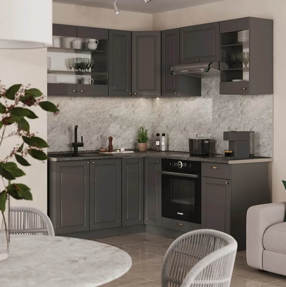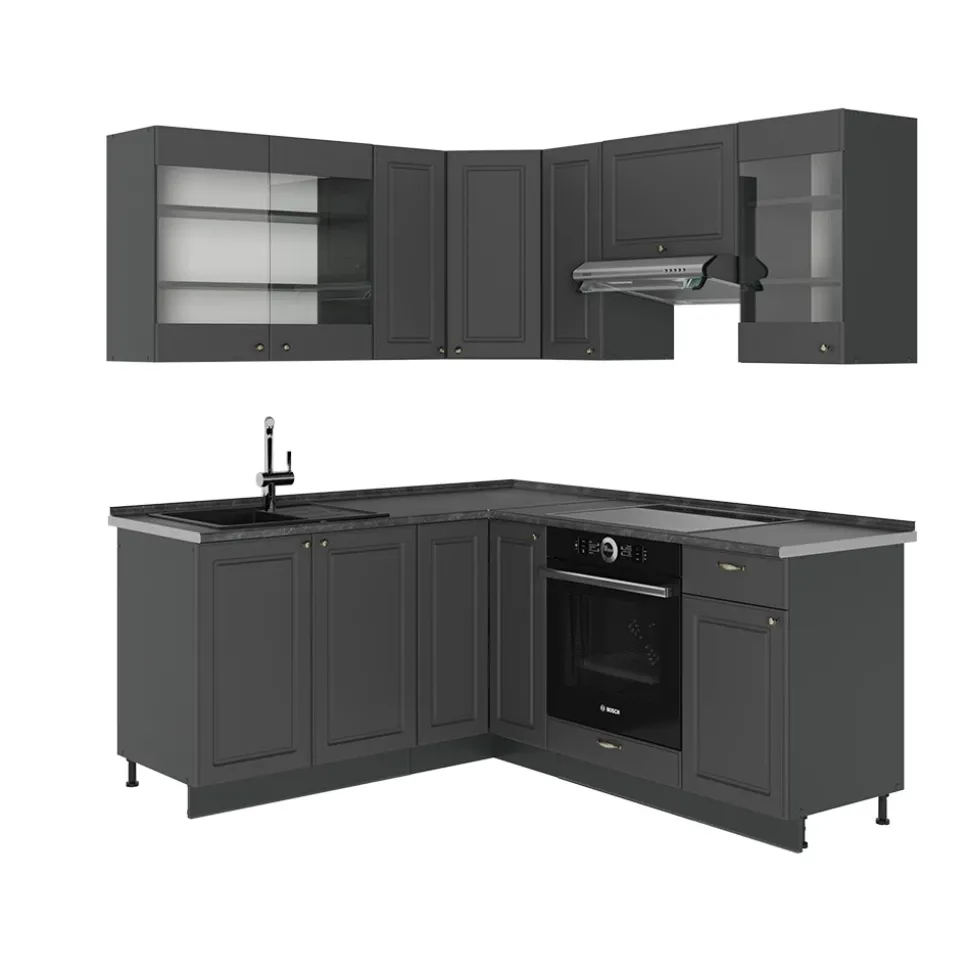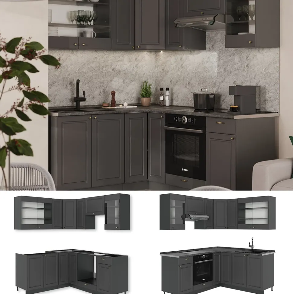 - Die Küchen in L-Form bietet zusätzliche Module und ein umstellbares Design nach Belieben. Die MDF-Fronten verleihen ihr eine stilvolle Optik.