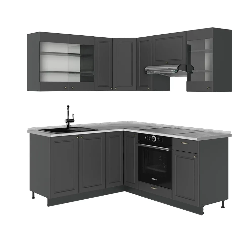 - Die Küchenzeile in L-Form bietet zusätzliche Module und ein umstellbares Design nach Belieben. Die MDF-Fronten verleihen ihr eine stilvolle Optik.