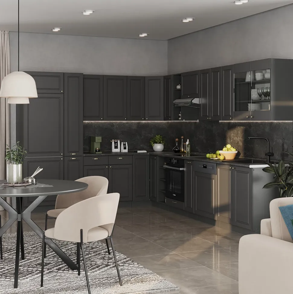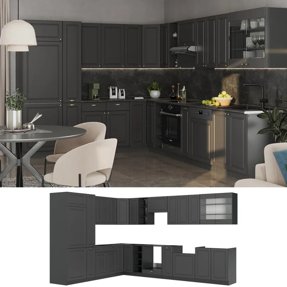 - Die Küche in L-Form bietet zusätzliche Module und ein umstellbares Design nach Belieben. Die MDF-Fronten verleihen ihr eine stilvolle Optik.