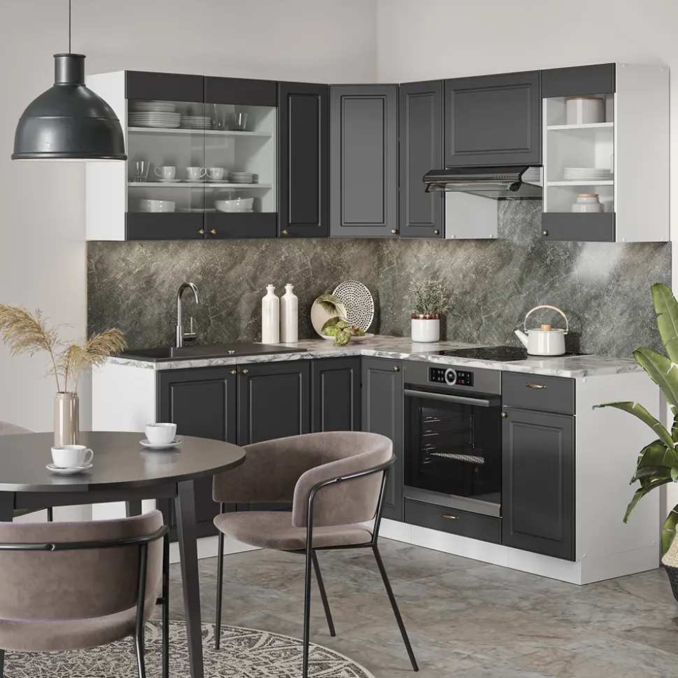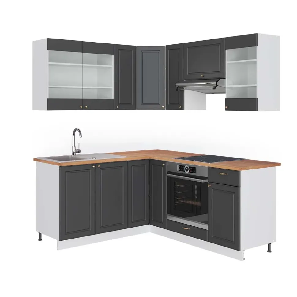 - MATERIAL: Die Winkelküche besteht aus pflegeleichter Spanplatte 16 mm, mit einer Melaminharzbeschichtung. Alle Fronten der Kücheneinheiten sind aus hochwertigem MDF hergestellt