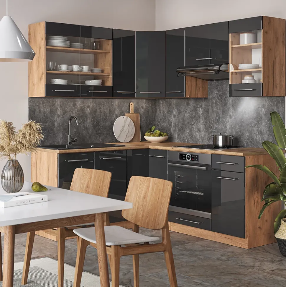 - MATERIAL: Die Winkelküche besteht aus pflegeleichter Spanplatte 16 mm, mit einer Melaminharzbeschichtung. Alle Fronten der Kücheneinheiten sind aus hochwertigem MDF hergestellt