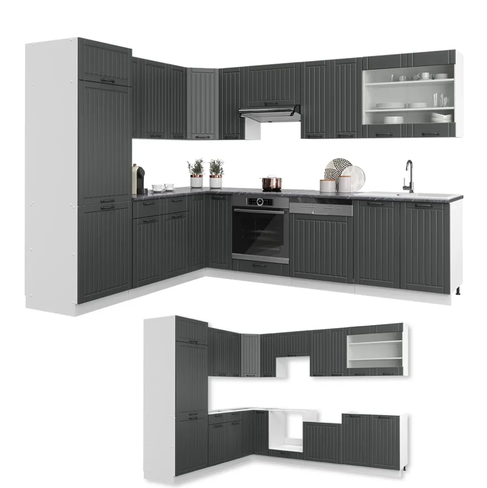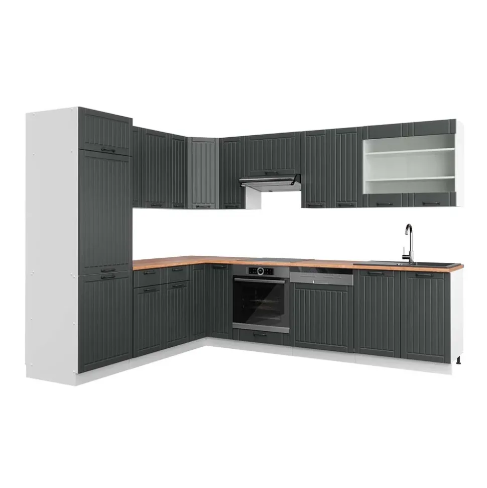 - Die Küchenzeile in L-Form bietet zusätzliche Module, die nach Belieben umgestellt werden können. Die MDF-Fronten sorgen für ein modernes Design.