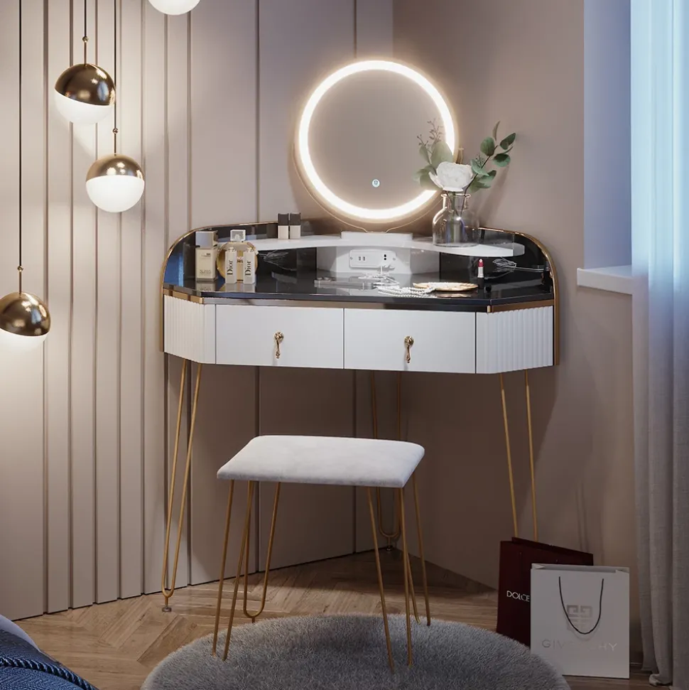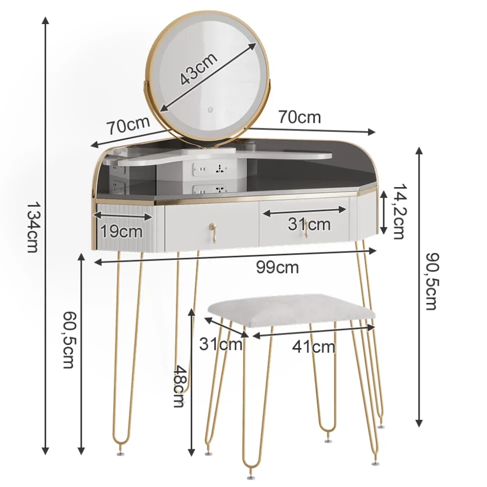 - MAßE: Der Frisiertisch für die Ecke hat eine Breite von 99 cm, eine Höhe von 134 cm und eine Tiefe von 70 cm. Alle detaillierten Größen sind auf den Fotos angegeben.