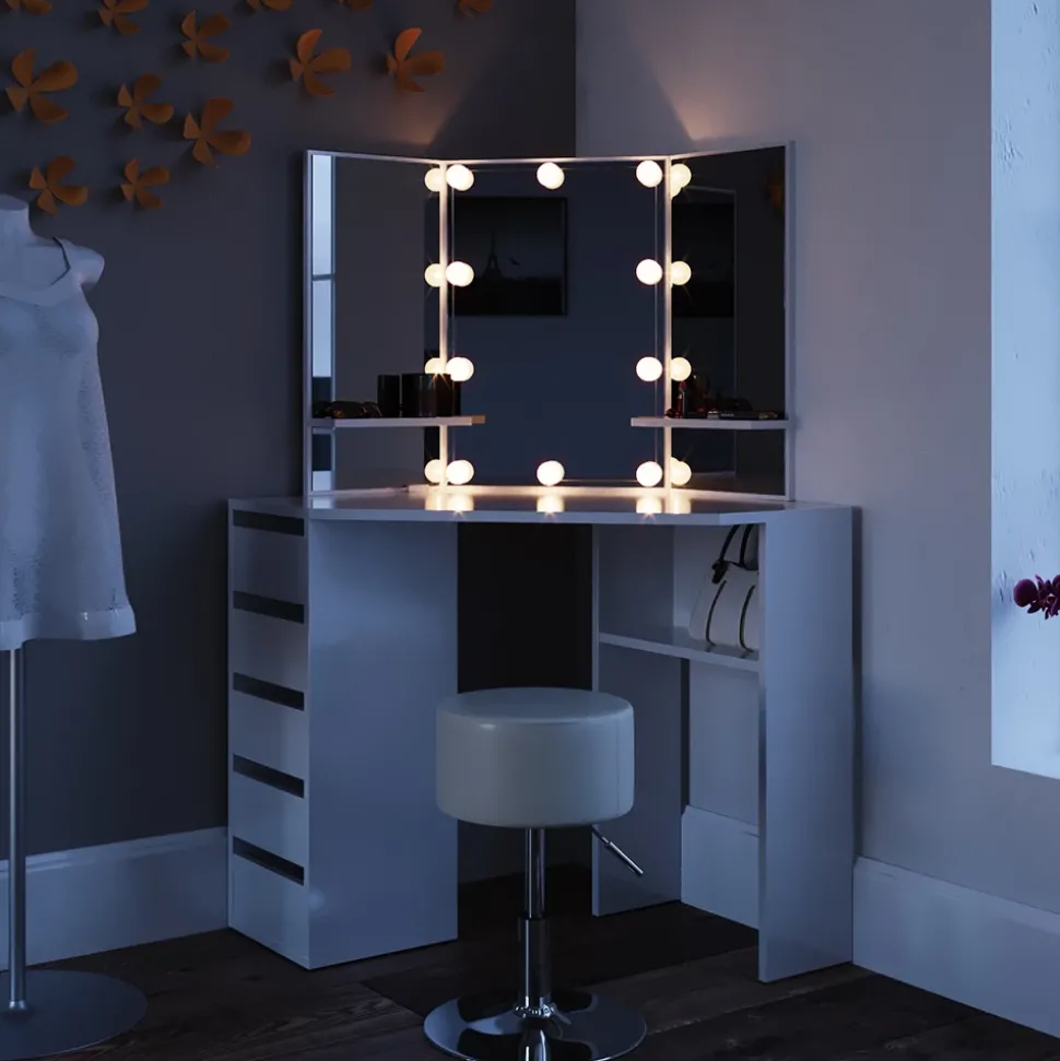- LIEFERUMFANG: Frisiertisch für die Ecke, LED-Lichterkette, Hocker, Montageanleitung, Montagematerial.
