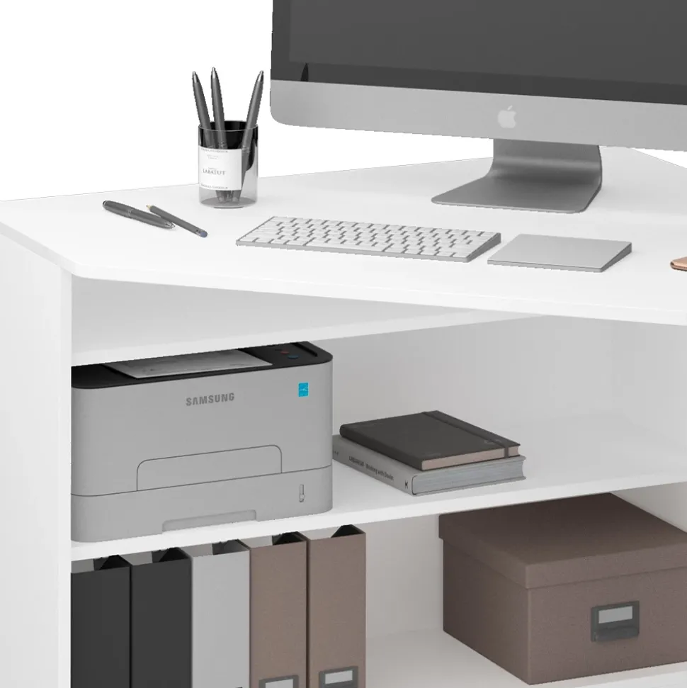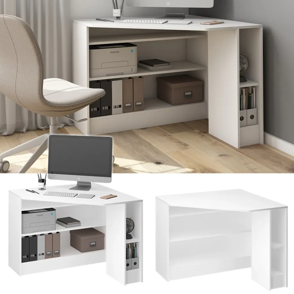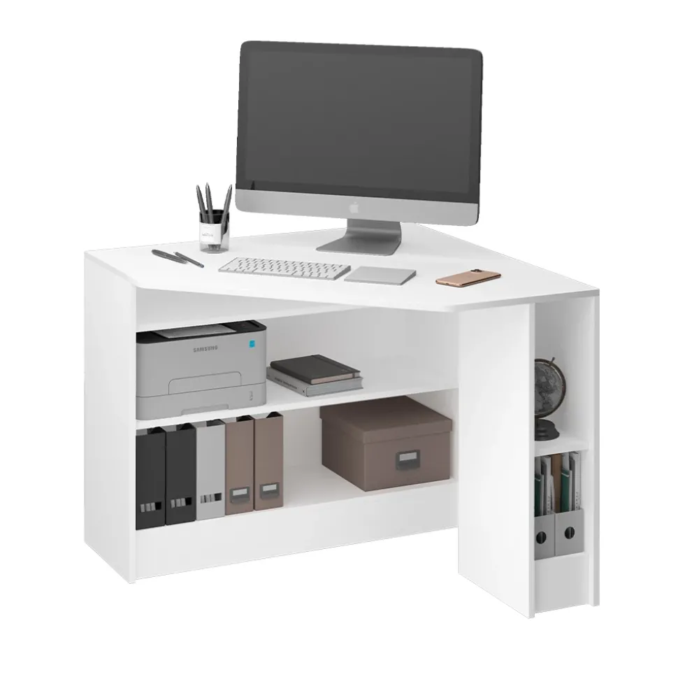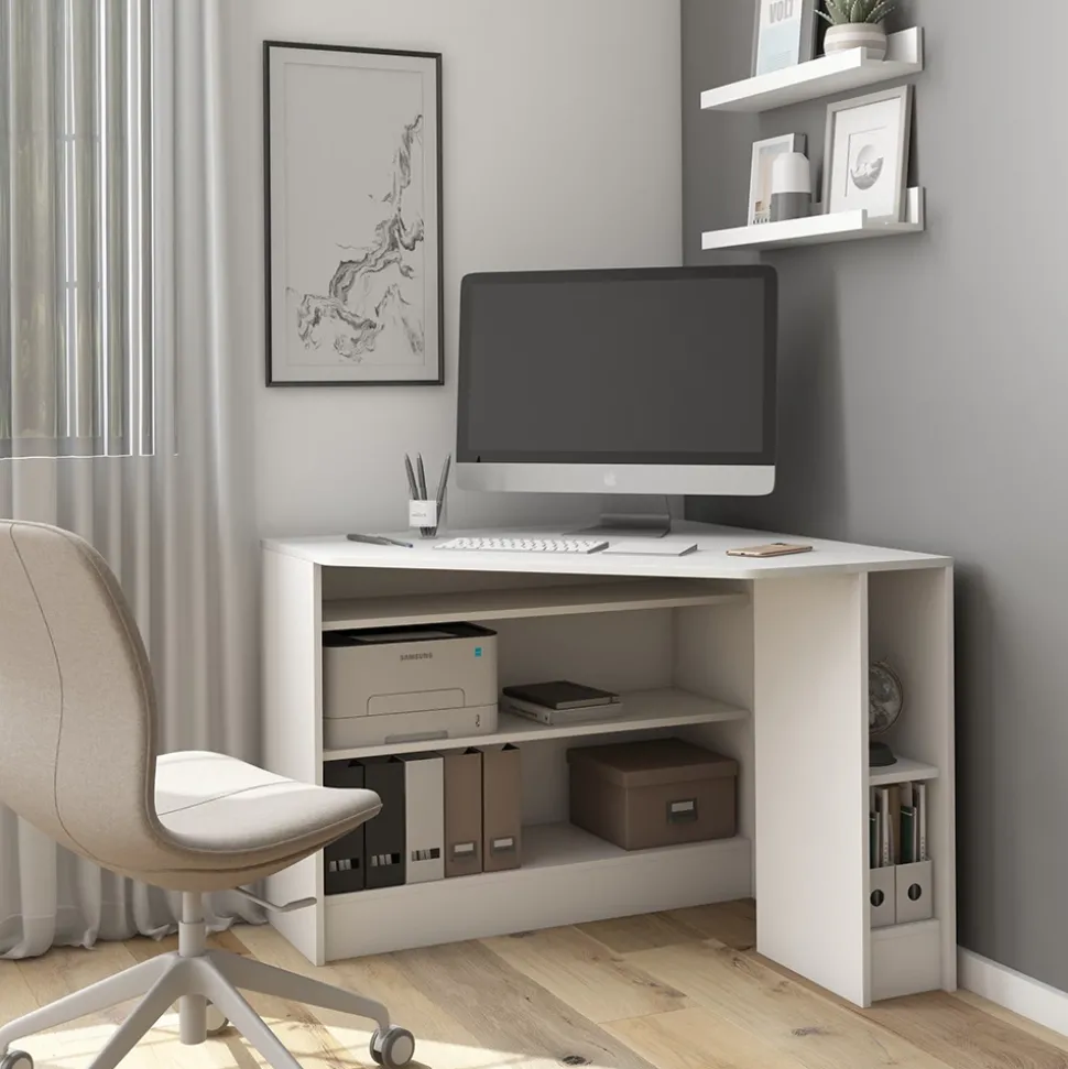 - Der Winkelschreibtisch bietet intelligente Ergonomie und offene Regale, um platzsparendes Arbeiten zu ermöglichen.