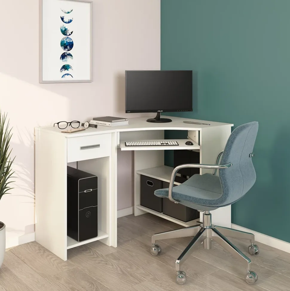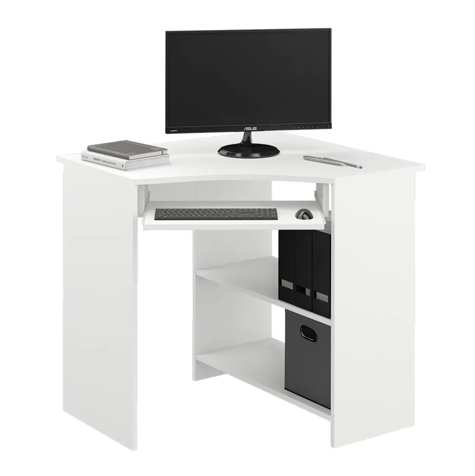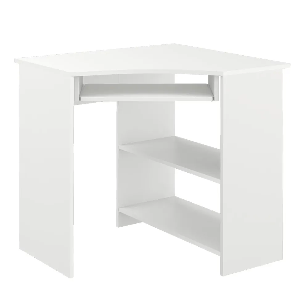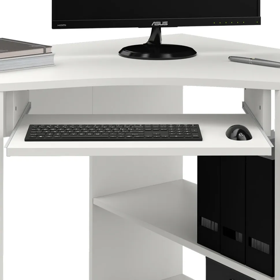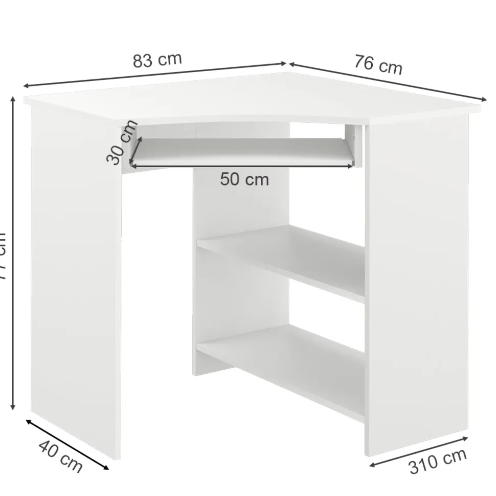 - Der Winkelschreibtisch bietet 2 große offene Ablagen und eine ausziehbare Tastaturablage, ideal für die Systemeinheit.