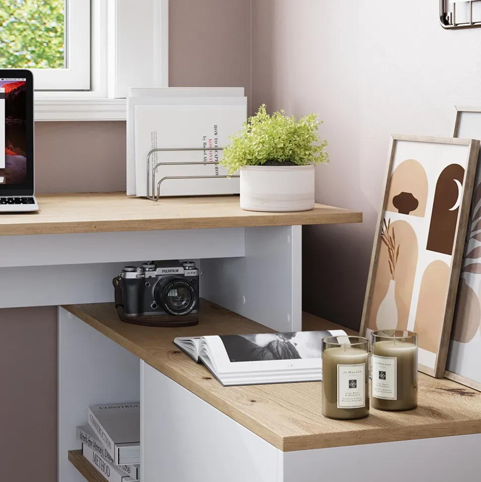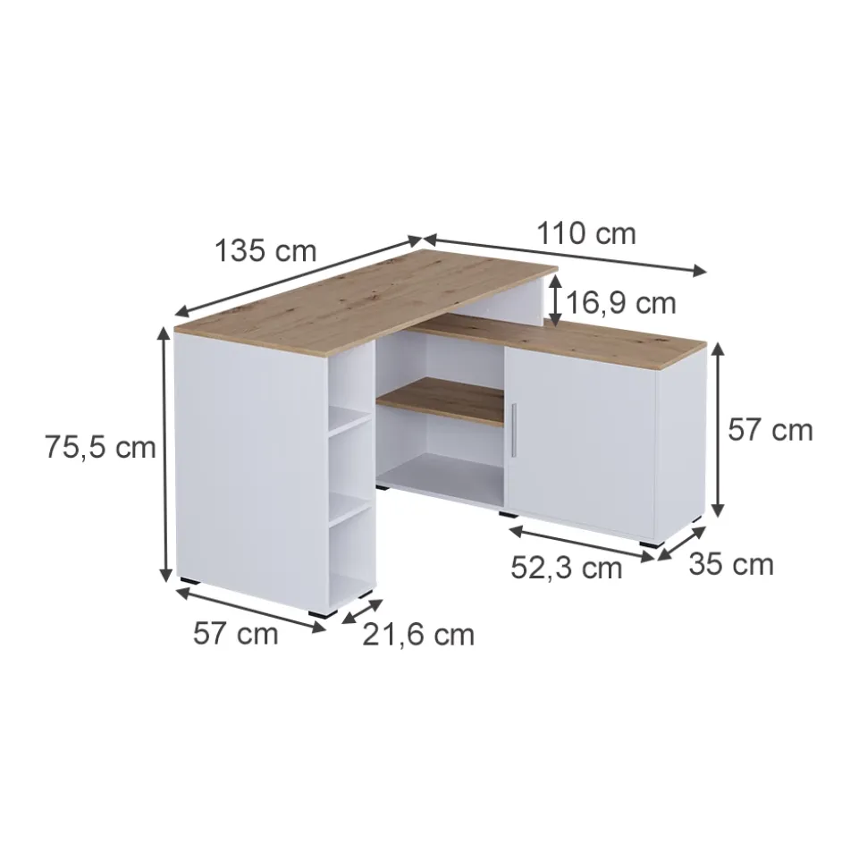 - MAßE: Der Schreibtisch in L-Form mit Regalen hat eine Tiefe von 110 cm, eine Breite von 135 cm und eine Höhe von 75,5 cm. Die detaillierten Größen sind auf den Fotos ersichtlich.