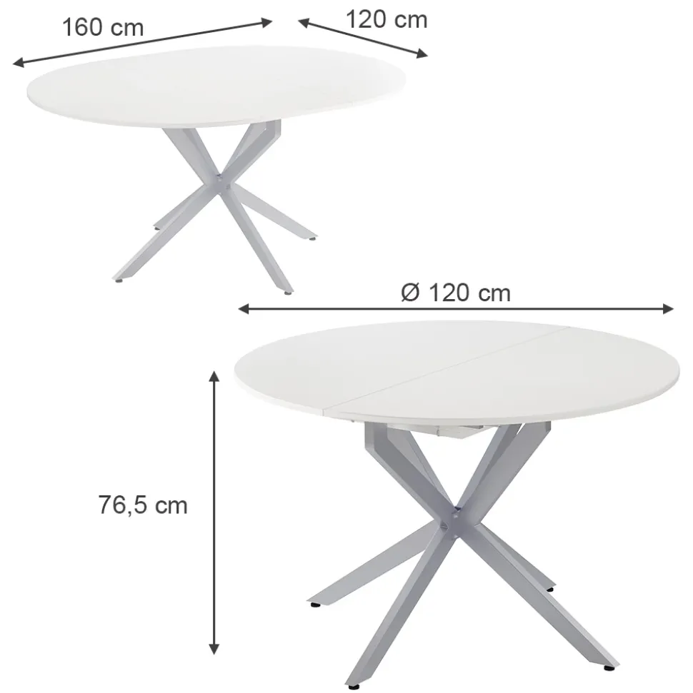 - MAßE: Der Küchentisch hat folgende Maße – Breite: 120 bis 160 cm, Höhe: 76,5 cm und Tiefe: 120 cm.