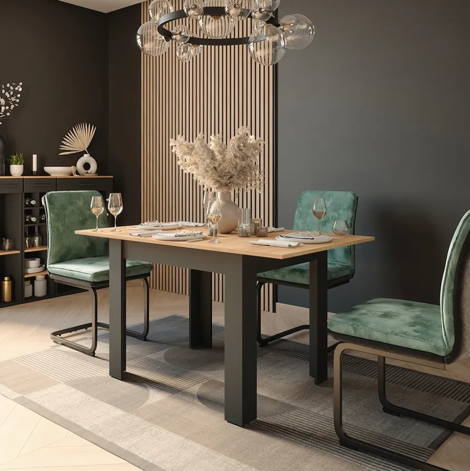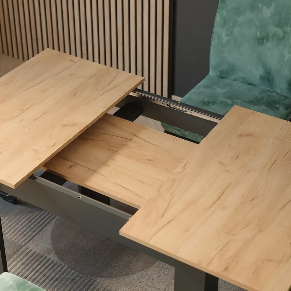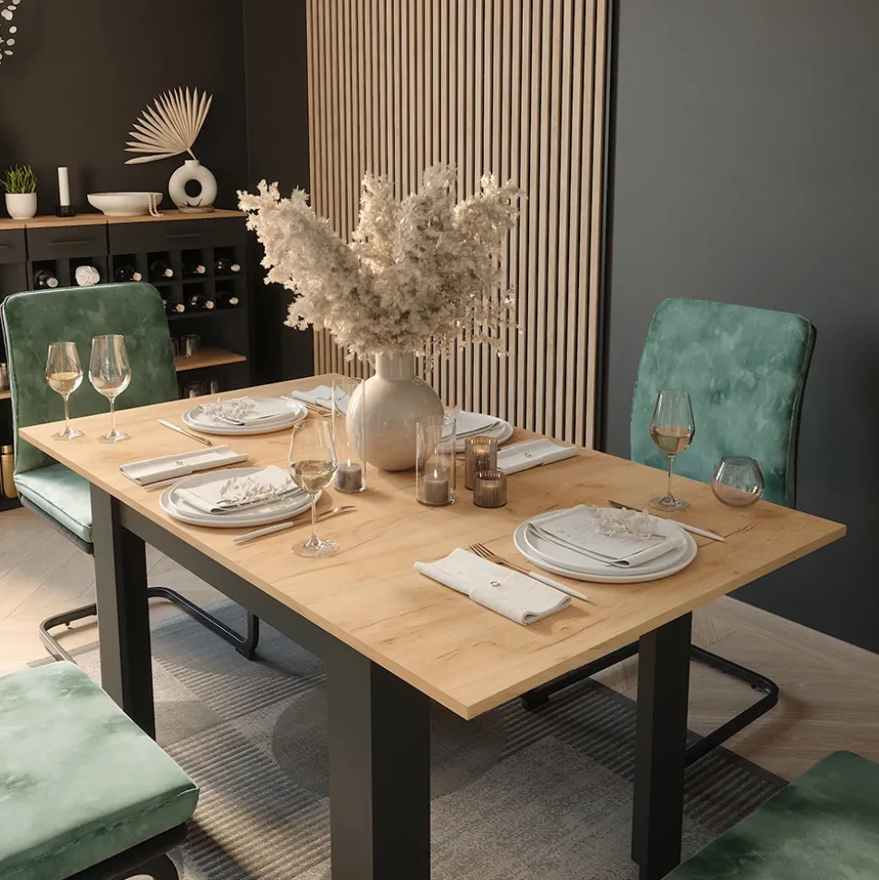 - Der ausziehbare Esszimmertisch verbindet modernes Design mit großzügigem Platzangebot für rundum gesellige Mahlzeiten.