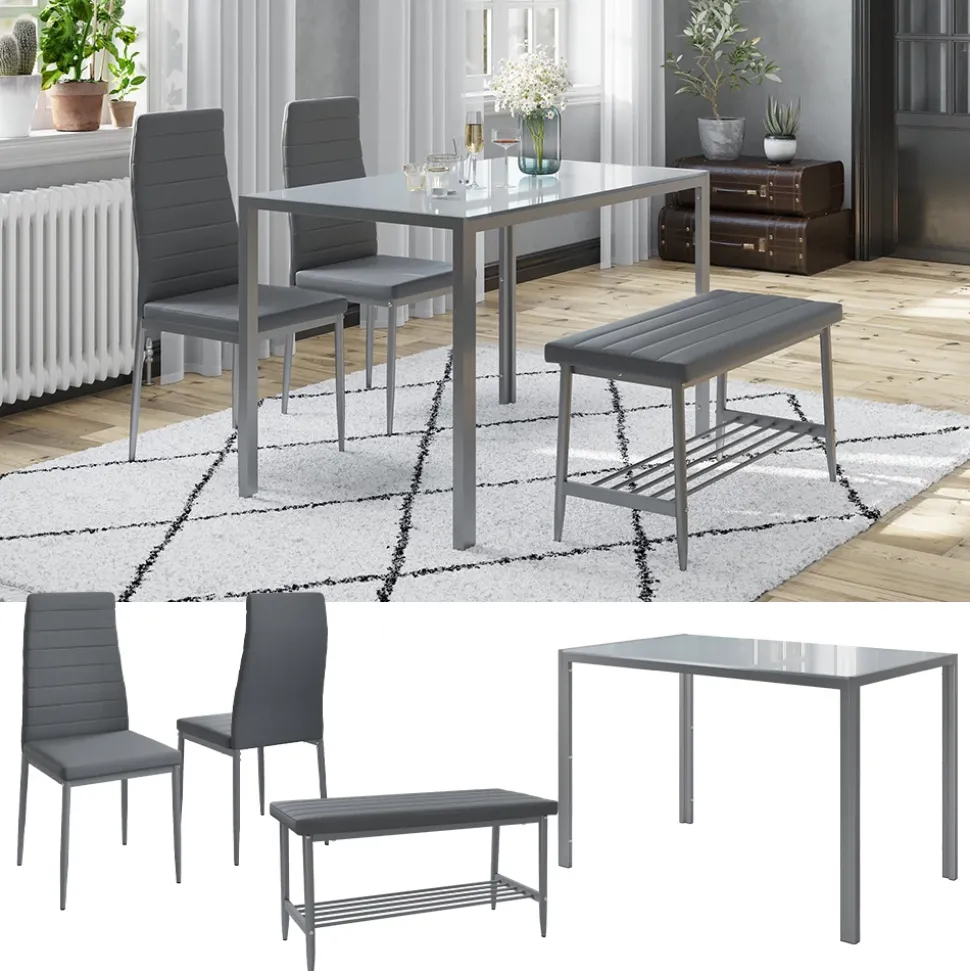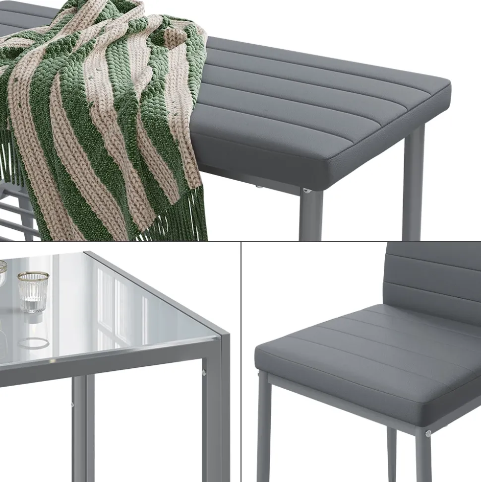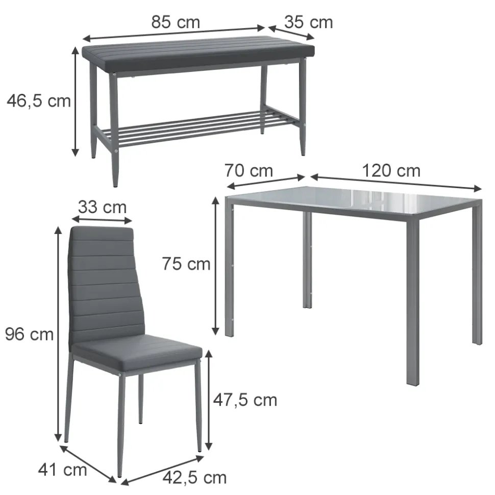 - MATERIAL: Der Esstisch hat eine Tischplatte aus 8 mm Glas und das Gestell besteht aus pulverbeschichtetem Stahlrohr. Die Bezüge der Bank und der Stühle sind aus Kunstleder gefertigt.