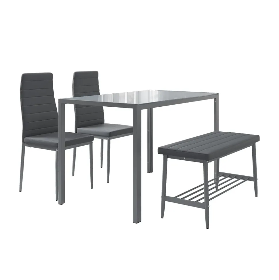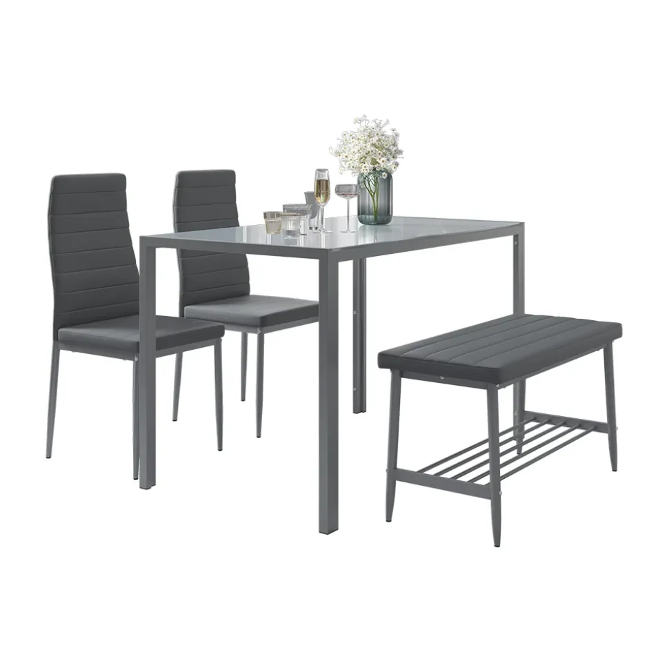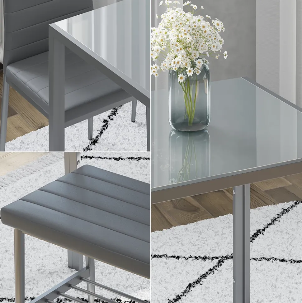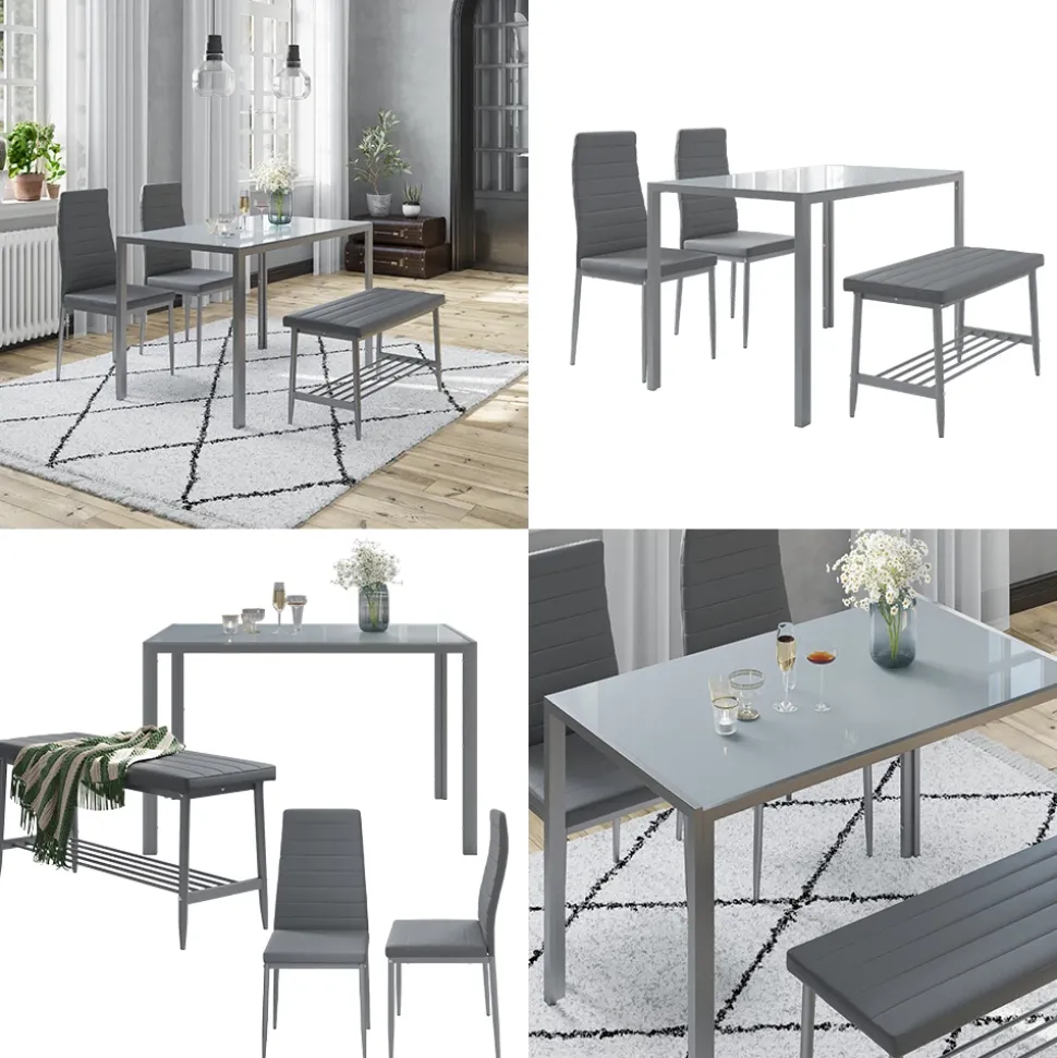 - MATERIAL: Der Esstisch hat eine Tischplatte aus 8 mm Glas und das Gestell besteht aus pulverbeschichtetem Stahlrohr. Die Bezüge der Bank und der Stühle sind aus Kunstleder gefertigt.
