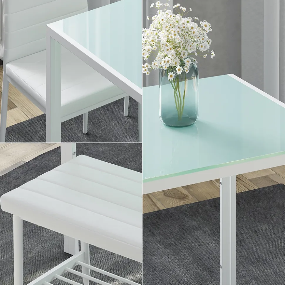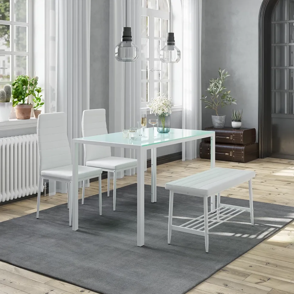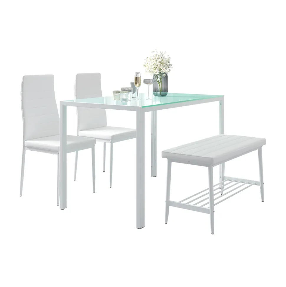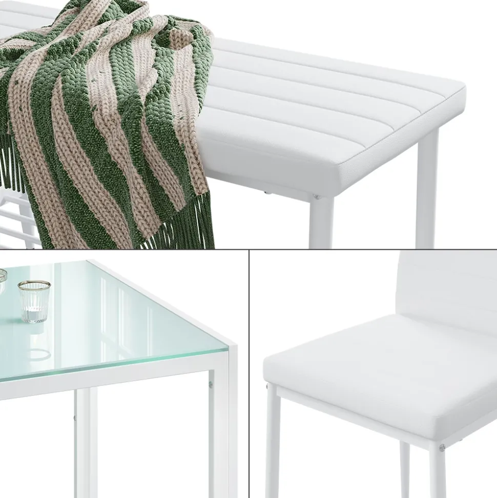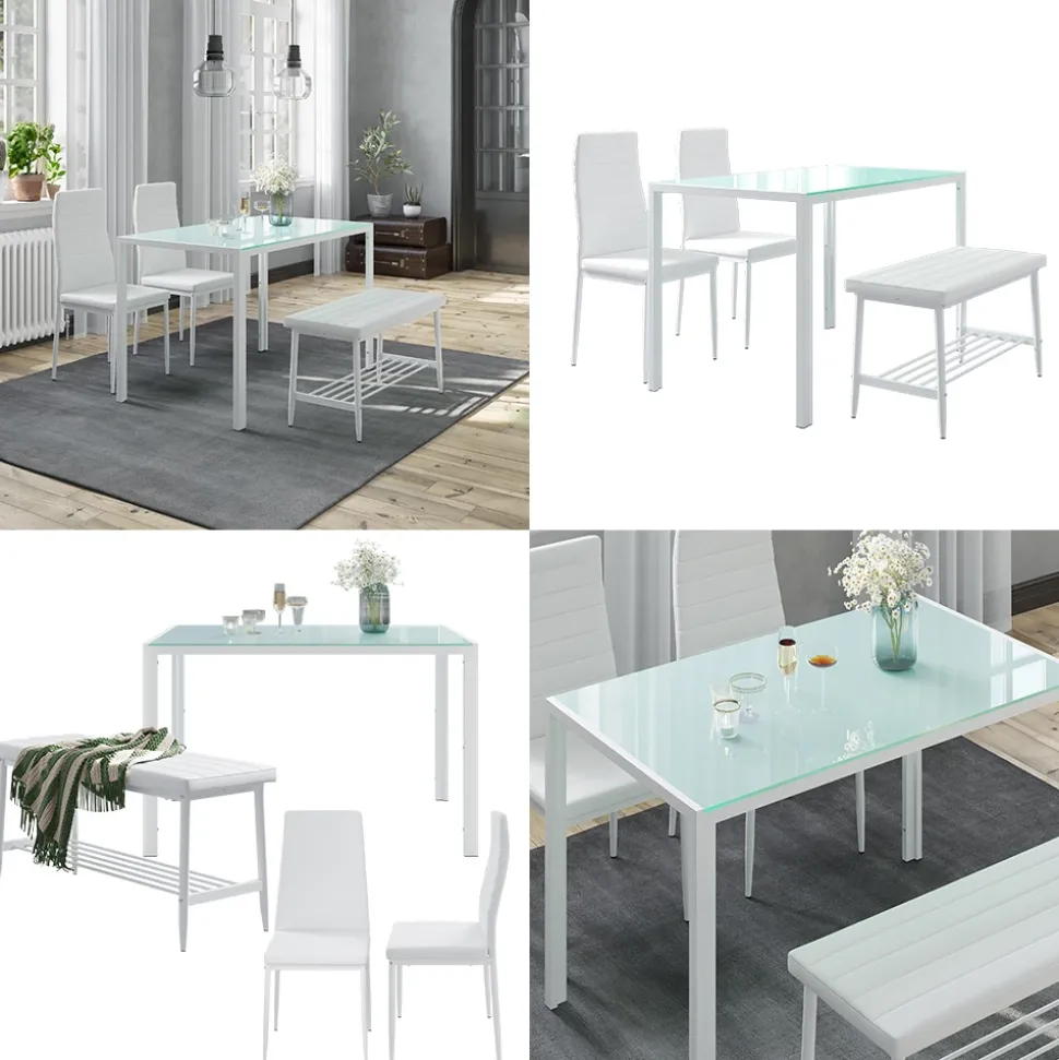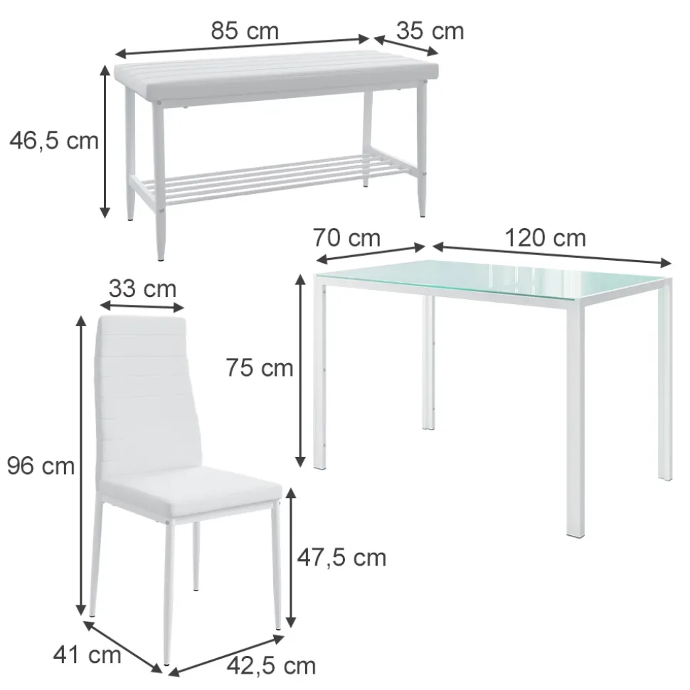 - MATERIAL: Der Esstisch hat eine Tischplatte aus 8 mm Glas und das Gestell besteht aus pulverbeschichtetem Stahlrohr. Die Bezüge der Bank und der Stühle sind aus Kunstleder gefertigt.