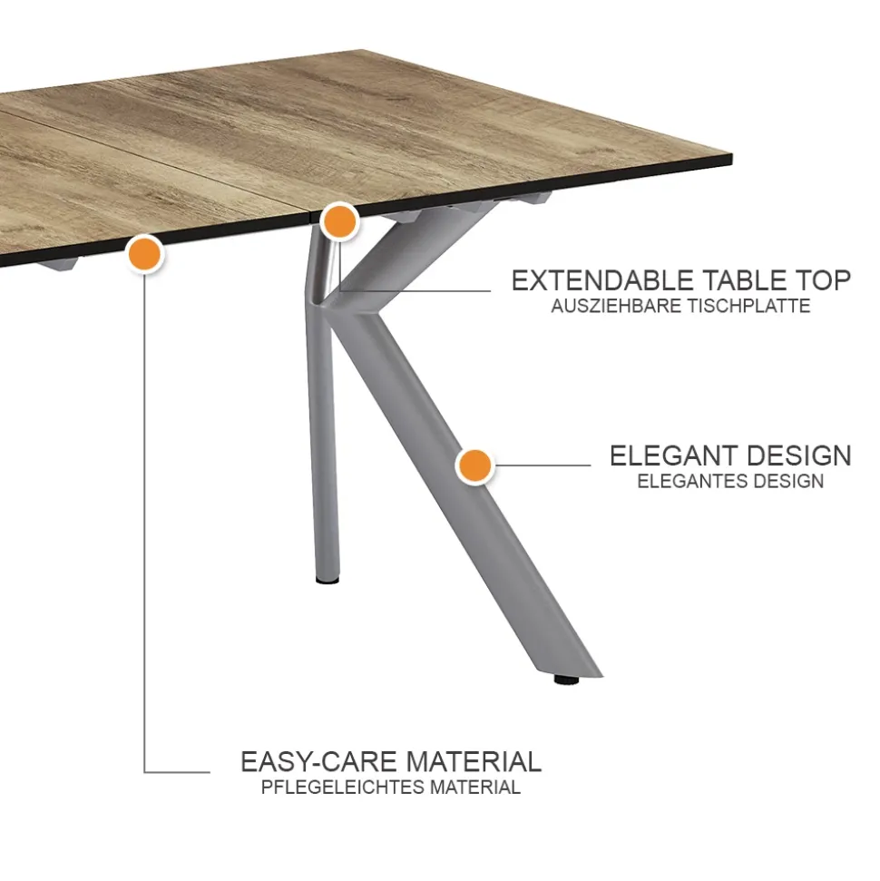 - Der ausziehbare Esszimmertisch ist leicht kombinierbar mit anderen Möbeln und perfekt für das Esszimmer. Er bietet genügend Platz für gesellige Mahlzeiten und lässt sich bei Bedarf erweitern.