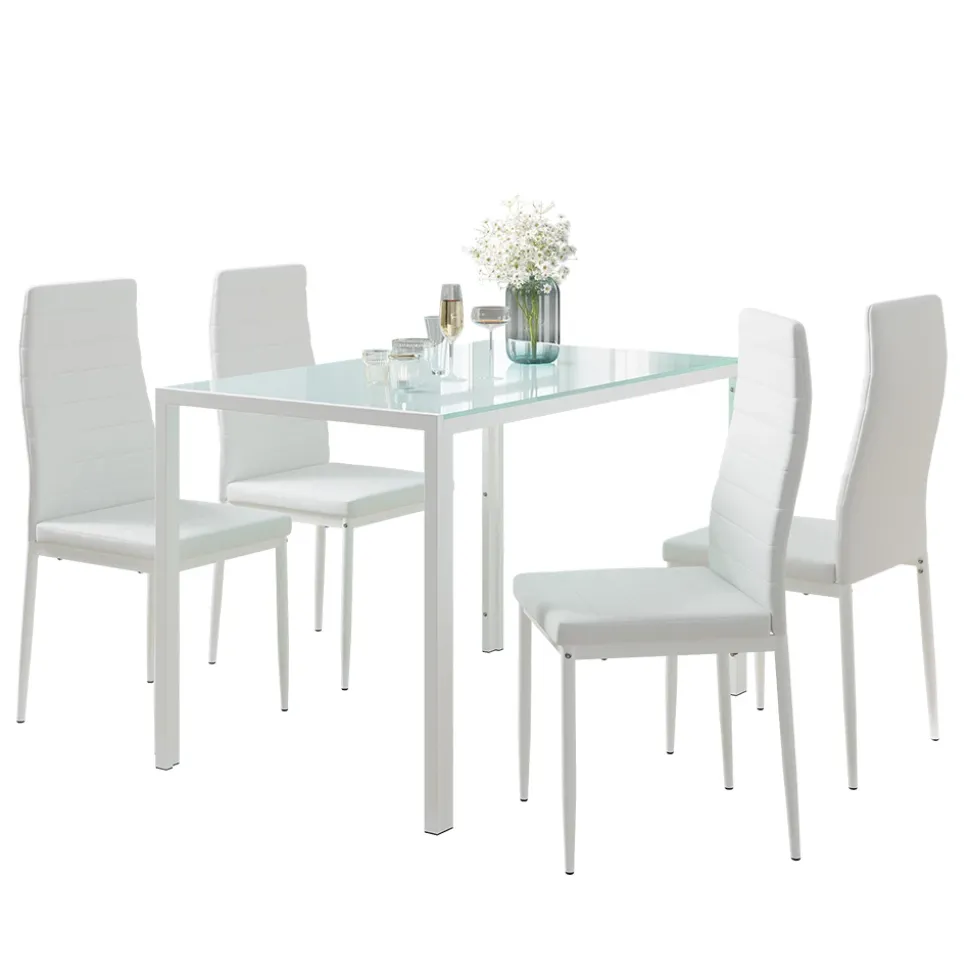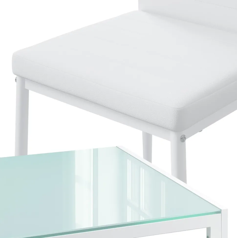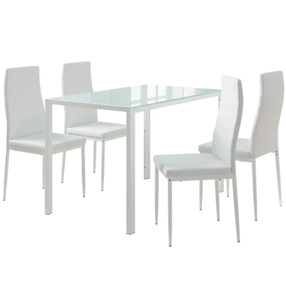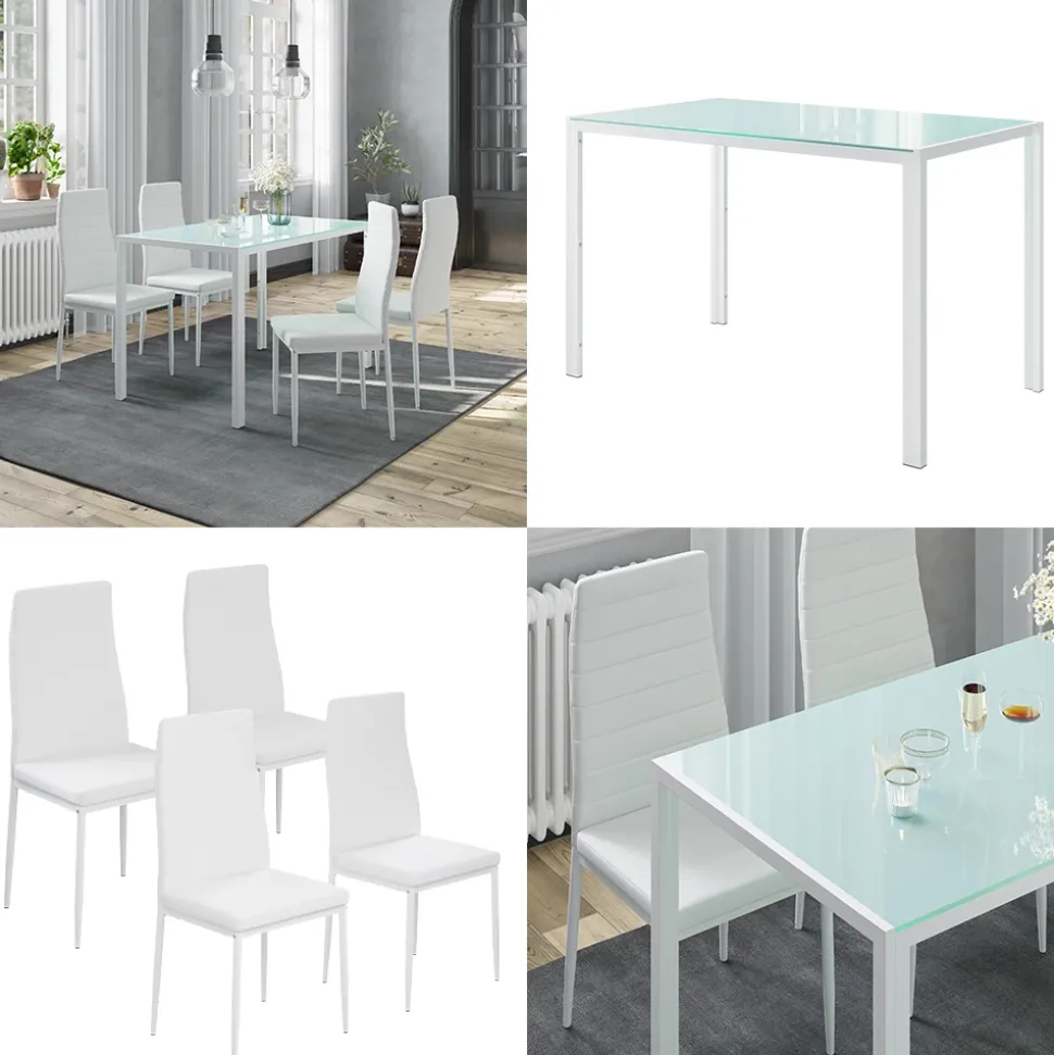 - MATERIAL: Die Tischbeine sind aus pulverbeschichtetem Metall; die Tischplatte ist aus gehärtetem Glas. Die Stühle haben Sitz- und Rückenflächen aus Polyurethan und pulverbeschichtete Metallbeine.