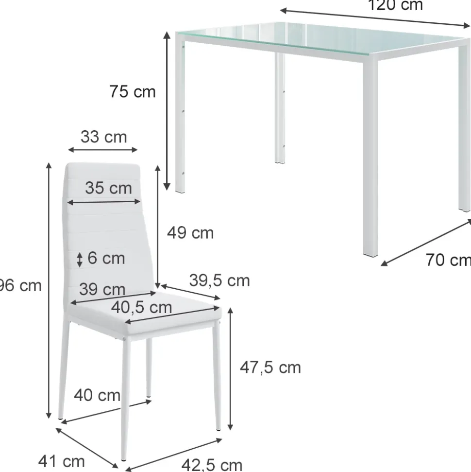 - PRODUKTMAßE: Küchentisch: 120 x 70 x 75 cm (BxHxT), Glasplatte 8 mm, 21,5 kg. Tischbeine: 30 x 20 x 0,8 mm. Stuhl: 40,5 x 96 x 48 cm, 3,84 kg. Stuhlbeine Ø 25 mm.