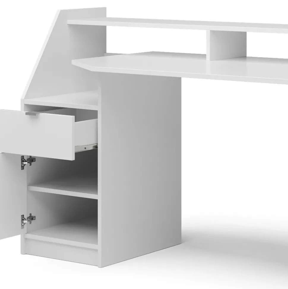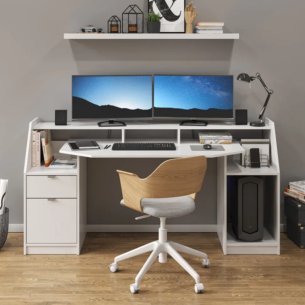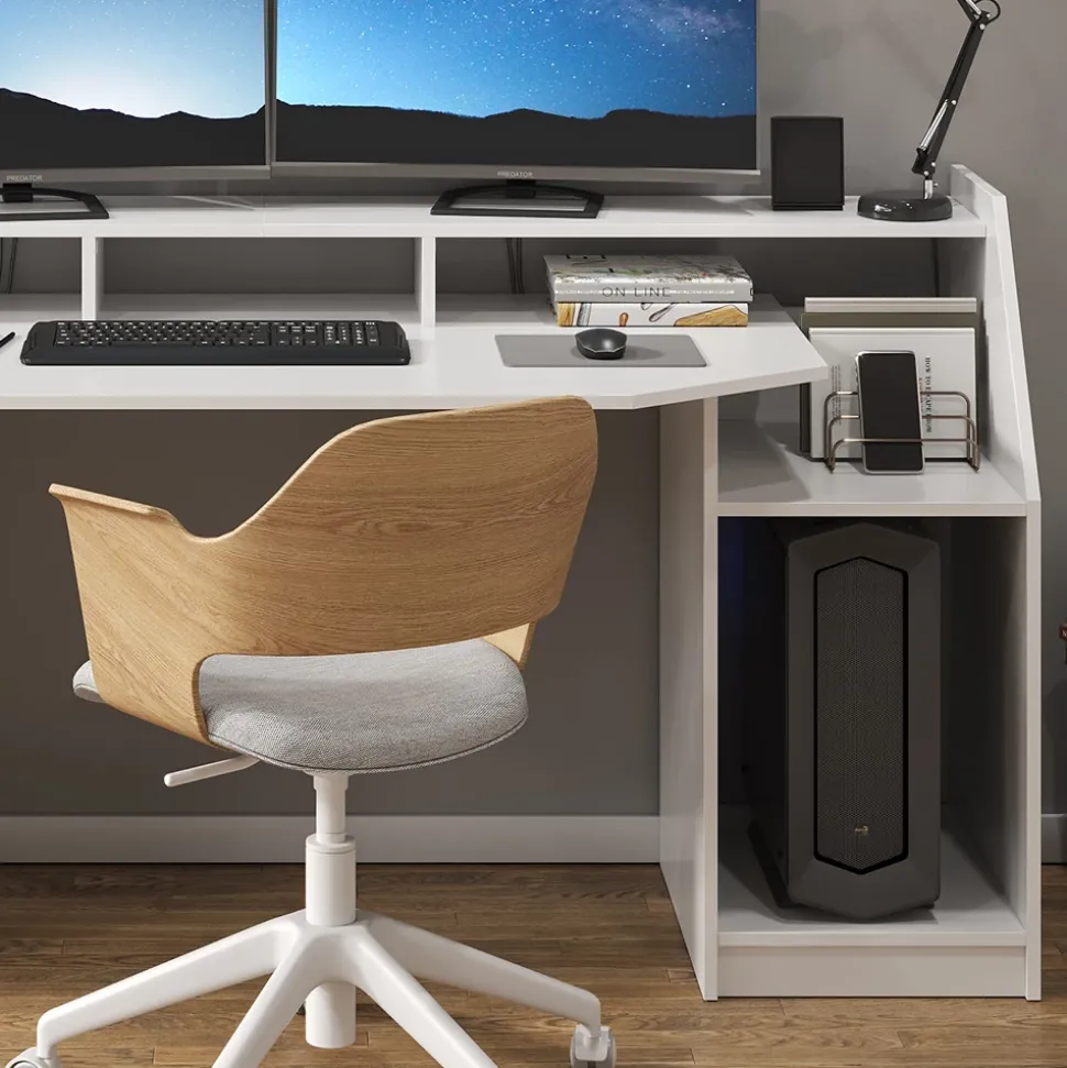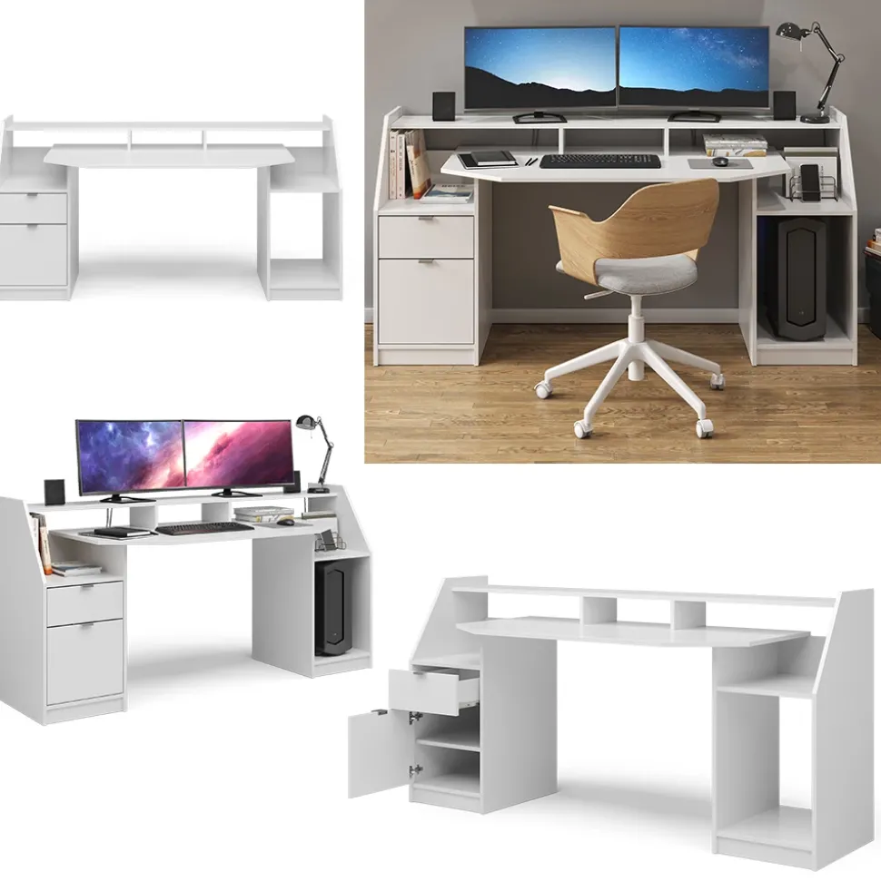 - Der Computertisch bietet offene und geschlossene Ablagen mit einem Regal für Systemeinheit und ein Display über Kopf für eine bequeme Nutzung.