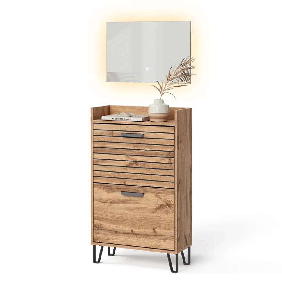 - LIEFERUMFANG: Schuhschrank, LED Spiegel mit indirekter Beleuchtung, Montageanleitung, Montagematerial (Dekoration nicht enthalten)