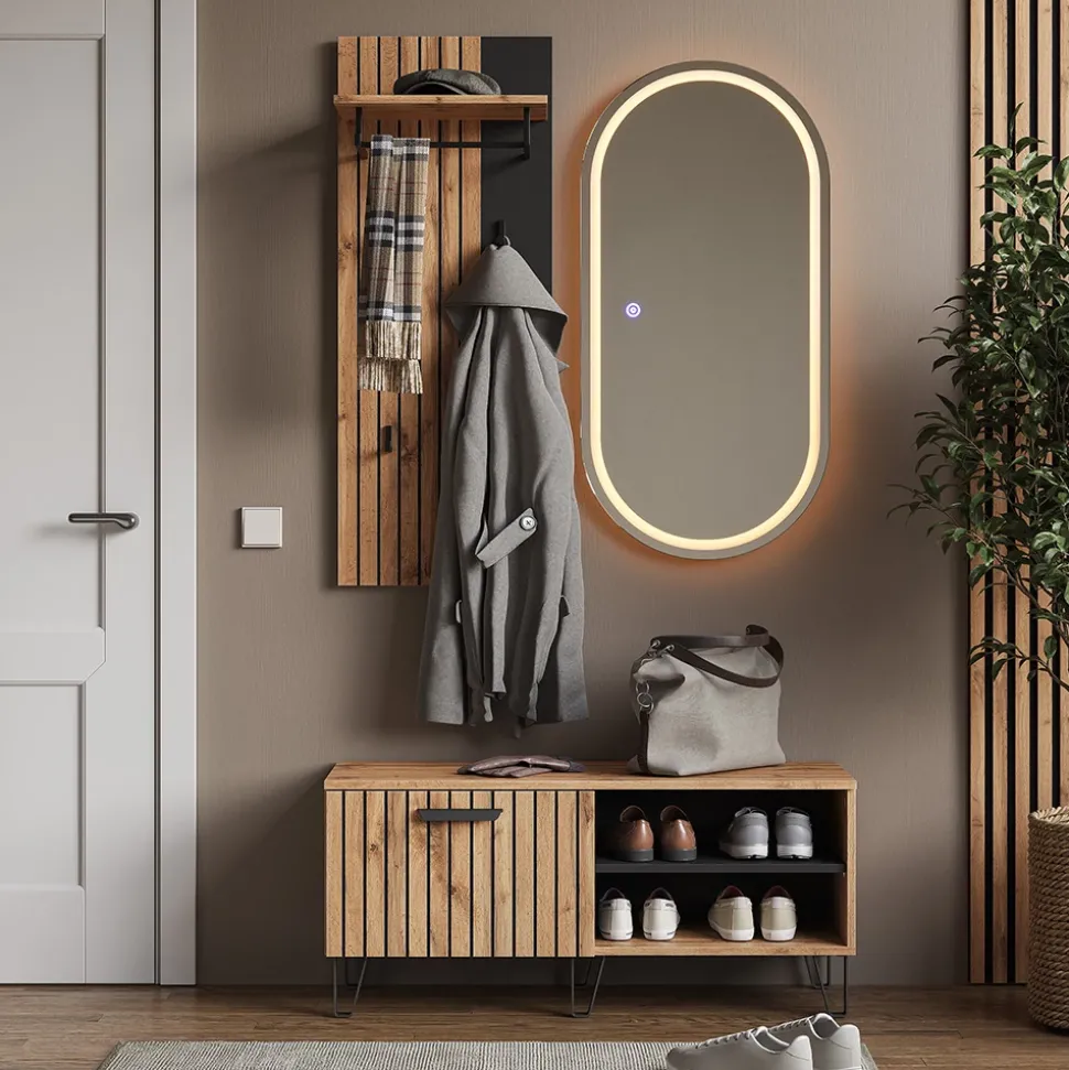 - Die Flurgarderobe bietet ausreichend Stauraum und ist perfekt für die Diele geeignet. Durch den LED-Spiegel mit direkter Beleuchtung ist er ideal für den Eingangsbereich.