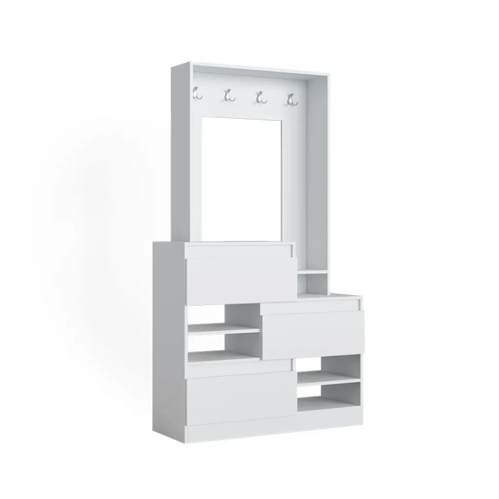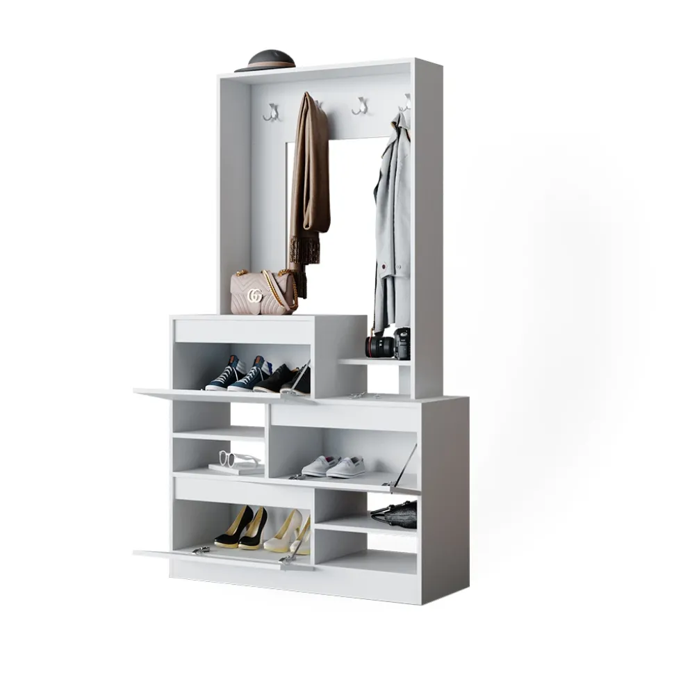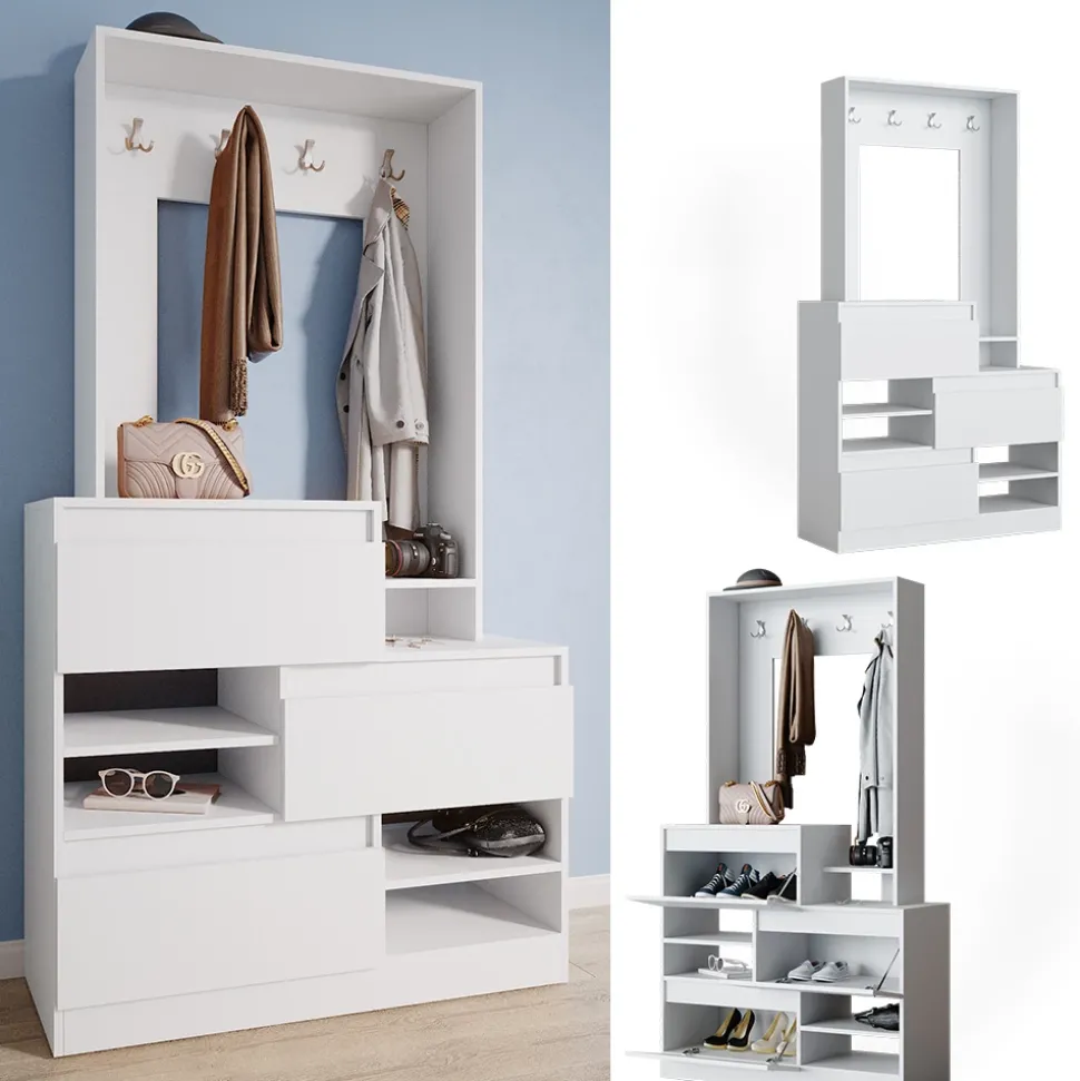 - Diese Garderobe überzeugt mit ihren 4 Mantelhaken, 3 klappbaren Schuhregalen, offenen Regalen und Ablageflächen zum Verstauen all Ihrer Schuhe und Taschen.