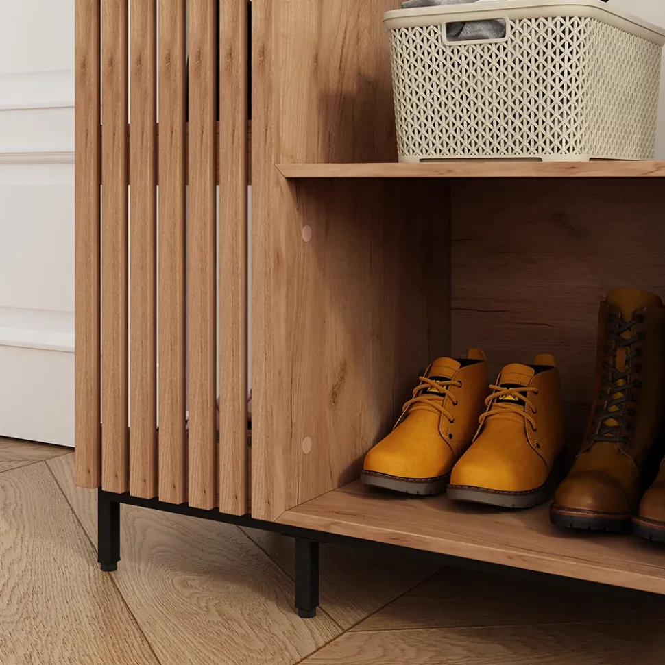 Gefertigt aus Holzwerkstoff und mit einer funktionalen Aufteilung aufgebaut, bietet sie eine platzsparende und pflegeleichte Lösung für die Garderobe.