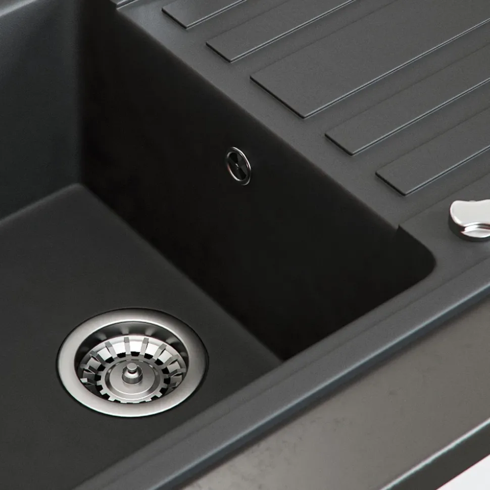 - Die Küchenspüle aus Granit mit Abtropfflügel ist widerstandsfähig gegen Chemikalien und stoßsicher – ideal für eine langlebige und robuste Küchenausstattung.