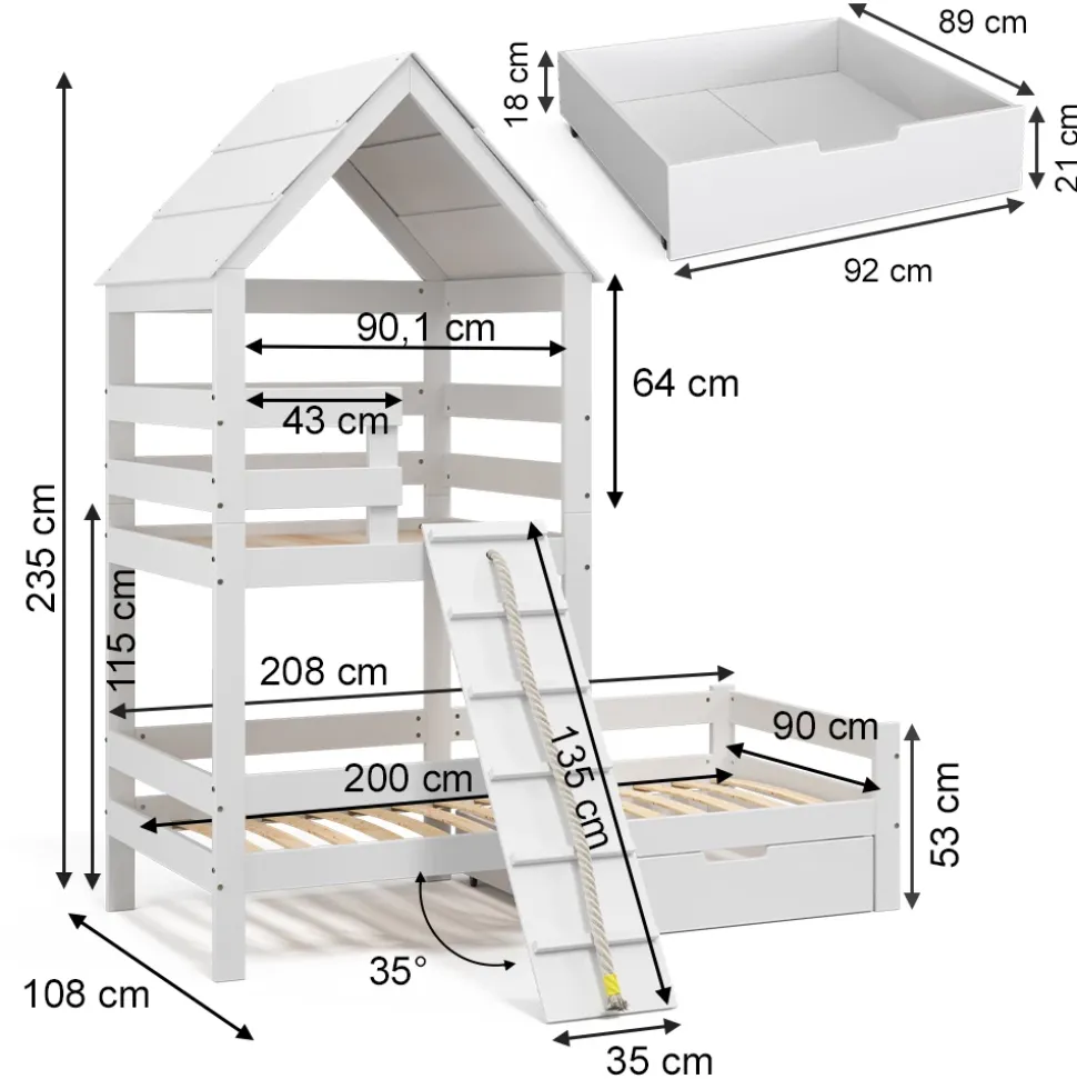 - Maße: Das Hausbett ist passend für Matratzen 200 x 90 cm und hat eine Höhe von 235 cm. Die detaillierten Größen der einzelnen Teile sind auf den Fotos angegeben.