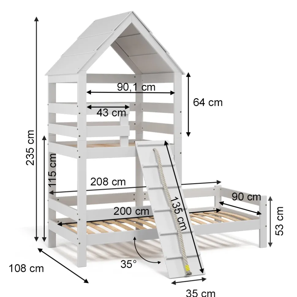 - Maße: Das Kinderbett ist passend für Matratzen 200 x 90 cm und hat eine Höhe von 235 cm. Die detaillierten Größen der einzelnen Teile sind auf den Fotos angegeben.