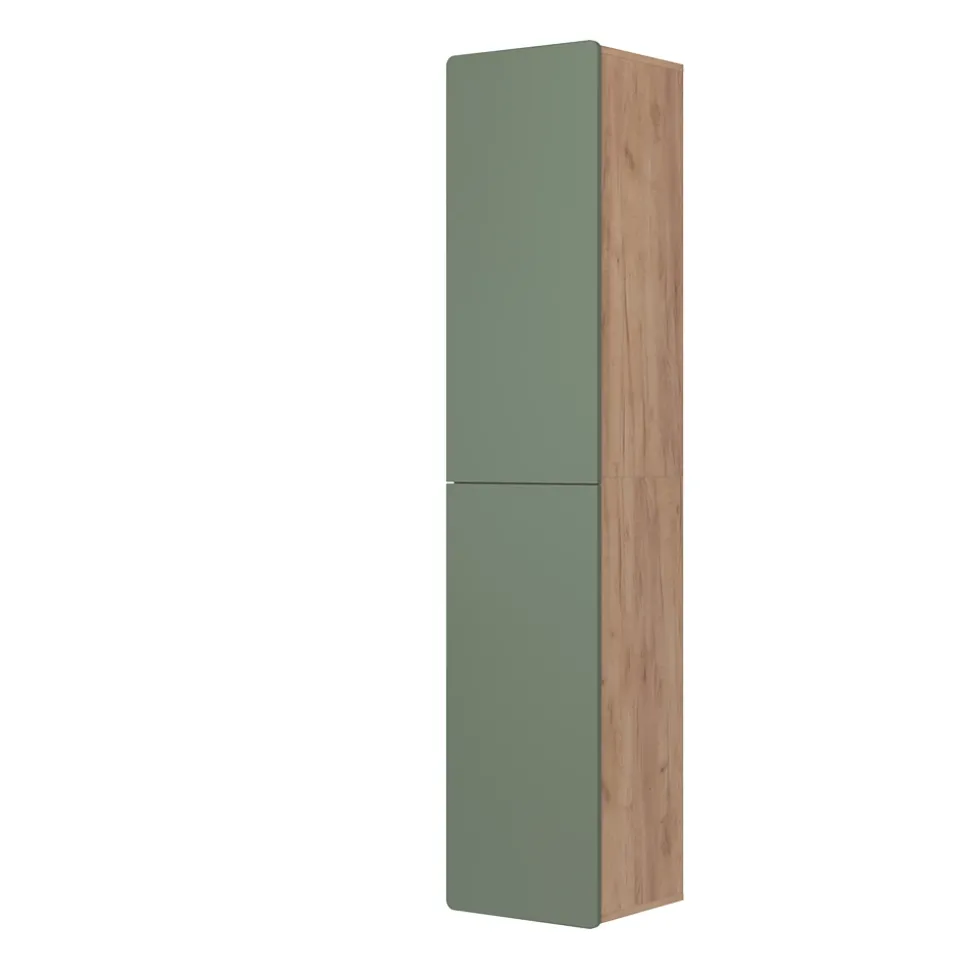 - Der Badezimmerhochschrank hat zwei geschlossene Ablagen und ein griffloses Fassadendesign. Er bietet Platz für vier geschlossene Einlegeböden.